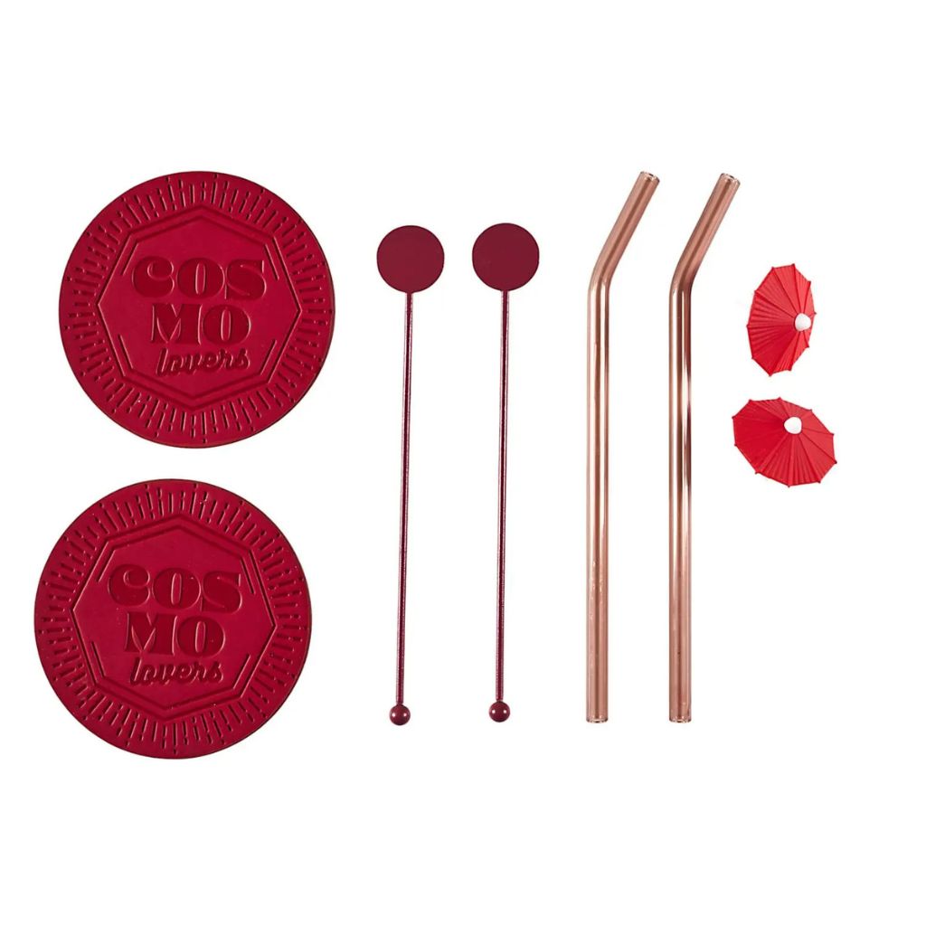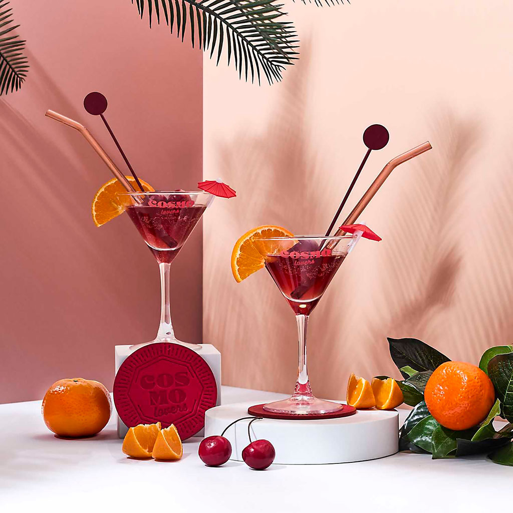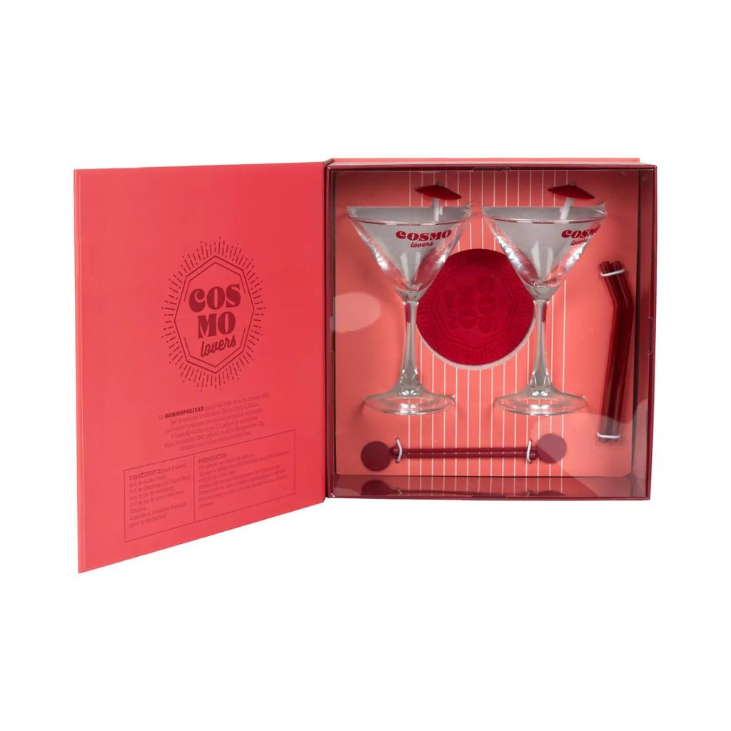 Le coffret contient 2 verres à Cosmopolitain "Cosmo lovers" au format parfait, 2 pailles en métal cuivré, 2 touillettes rouges, 2 dessous de verre assortis et 2 mini parasols pour une présentation pétillante et décontractée.
