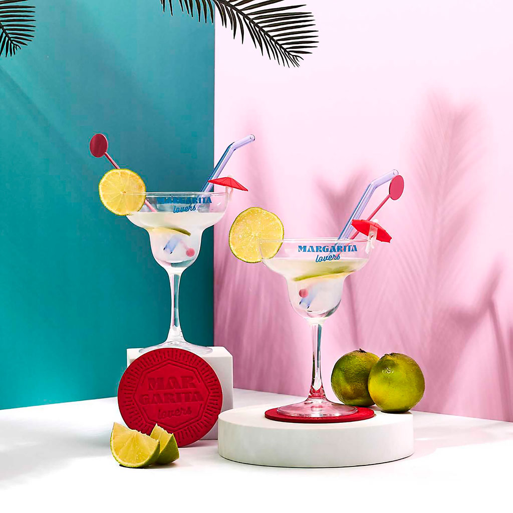 Ce kit complet comprend 2 verres à margarita au style rétro gravés "Margarita lovers", parfaits pour déguster vos cocktails givrés.