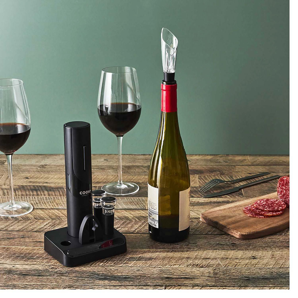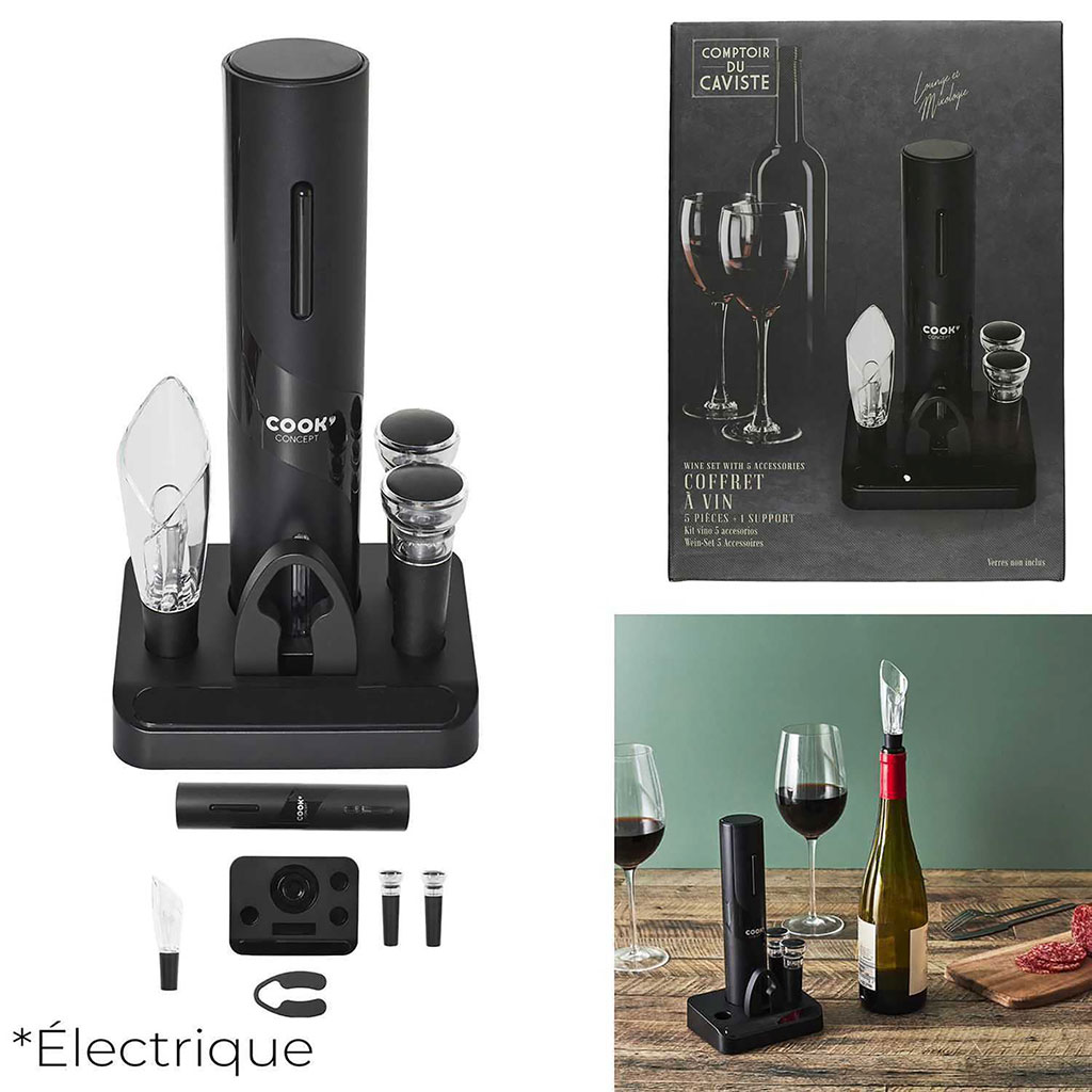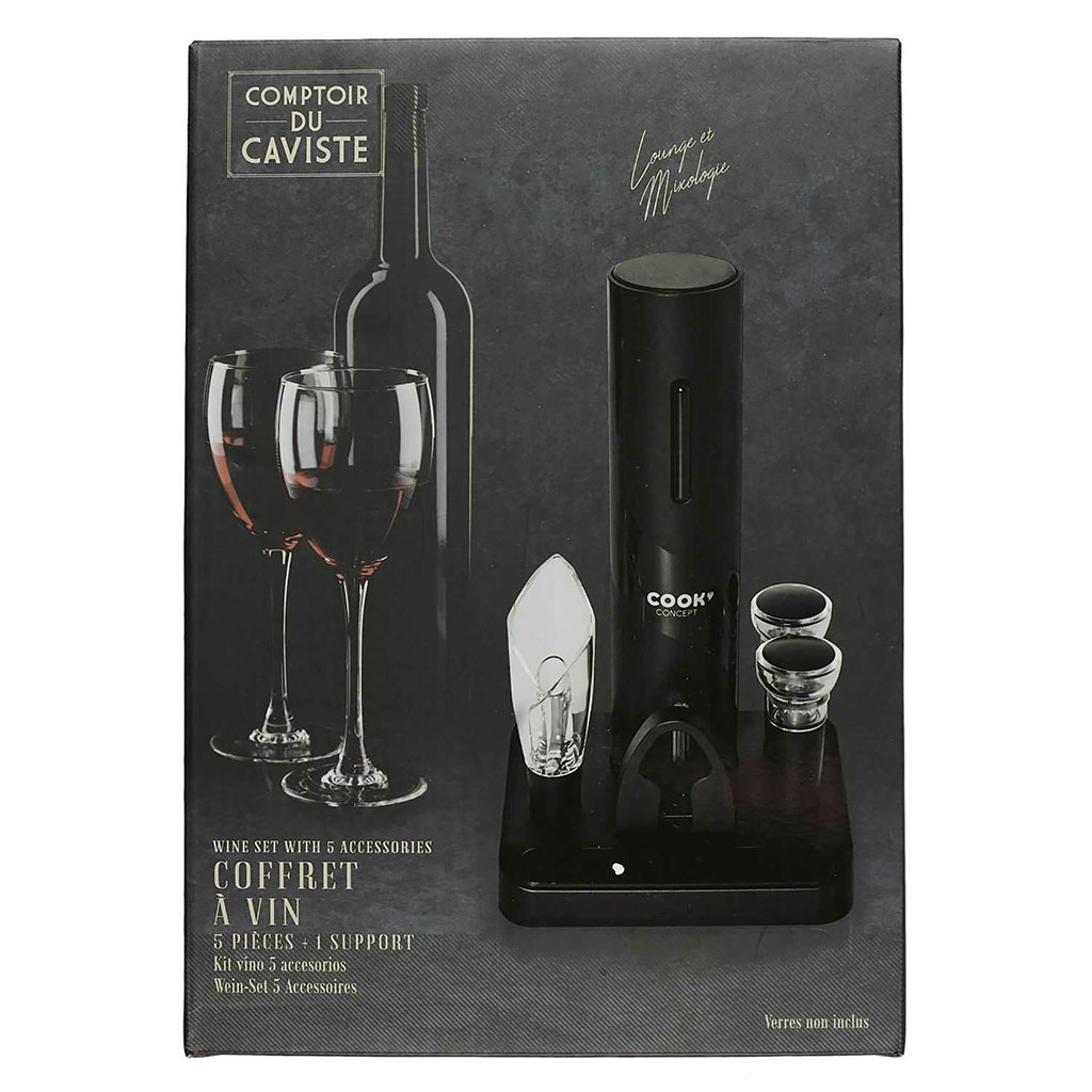 1 tire-bouchon électrique, 2 bouchons de conservation, 1 bouchon de service, 1 coupe capsule, 1 support.