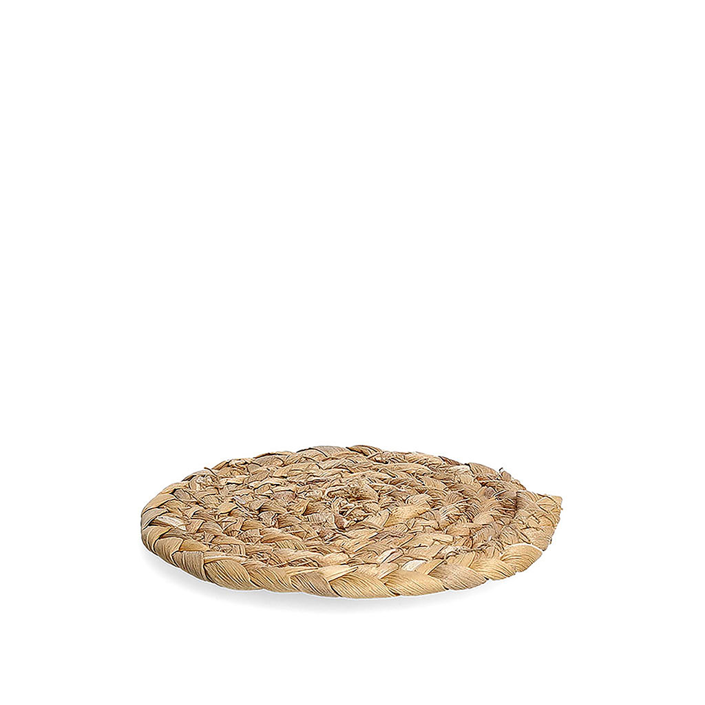 Ce dessous de verre est confectionné en jacinthe d'eau, une fibre naturelle tressée de manière régulière pour former un disque compact et uniforme.