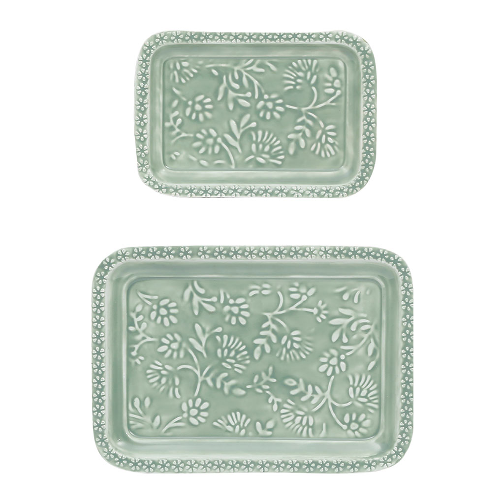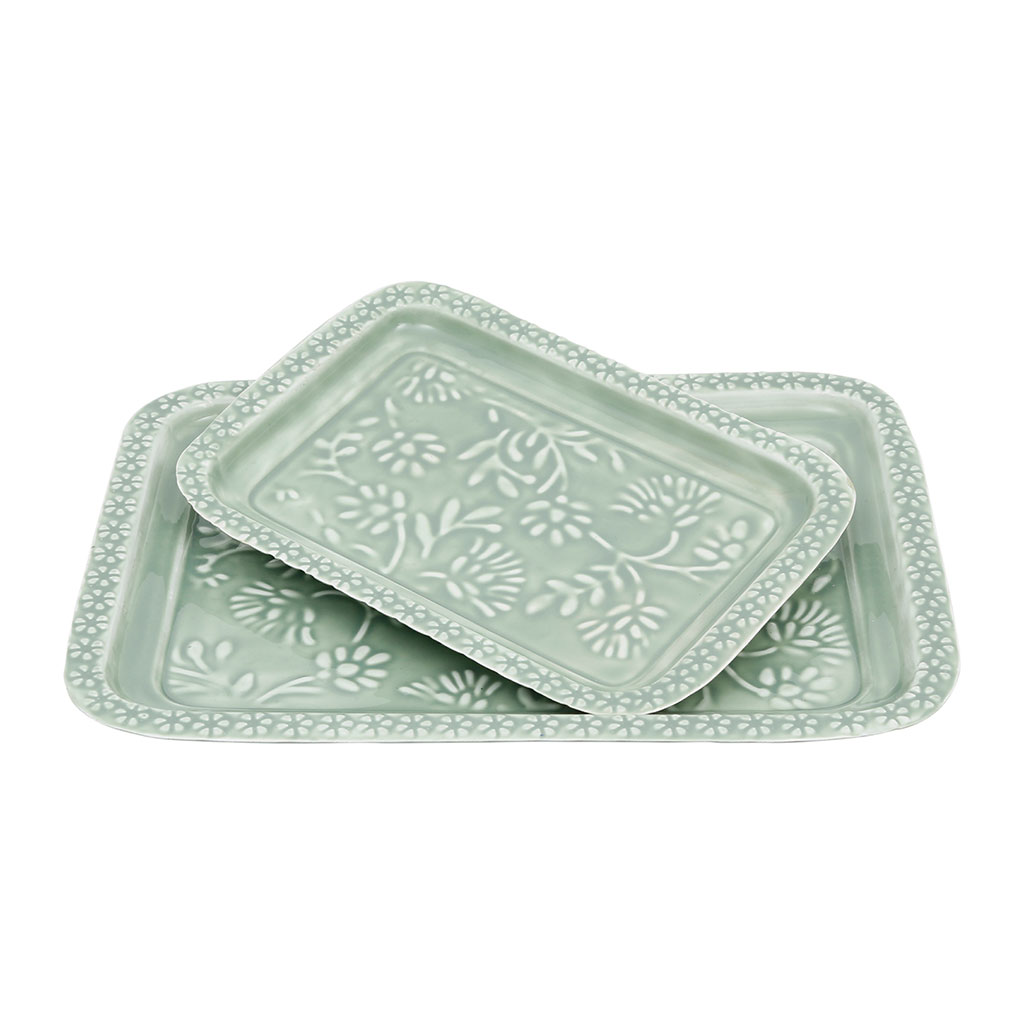 Découvrez ce lot de 2 plateaux en fer émaillé sauge au style baroque, parfaits pour sublimer votre table et apporter une touche de raffinement à votre décoration intérieure.