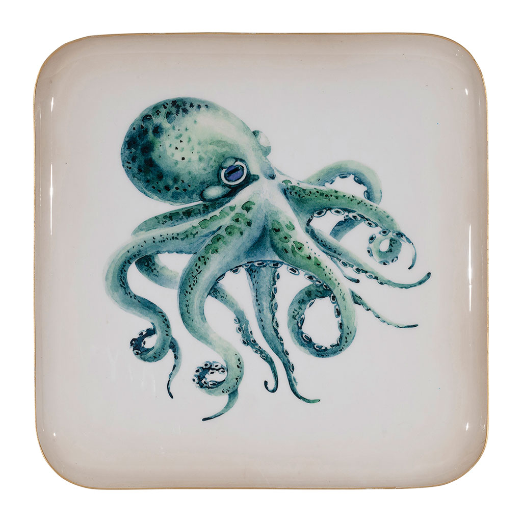 Ce plateau carré en fer turquoise séduit par son illustration marine représentant un poulpe.