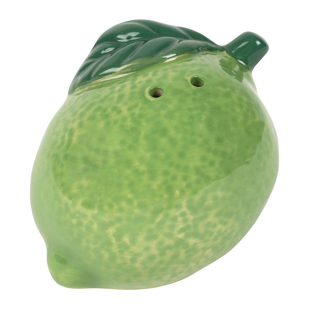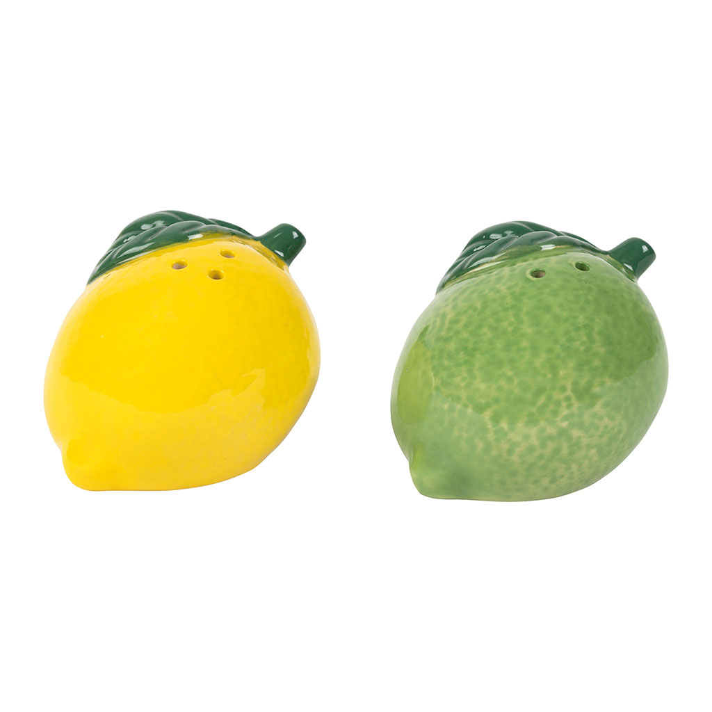 Découvrez cet ensemble de salière et poivrière en forme de citron, accompagné de son plateau en grès aux teintes jaune et vert.