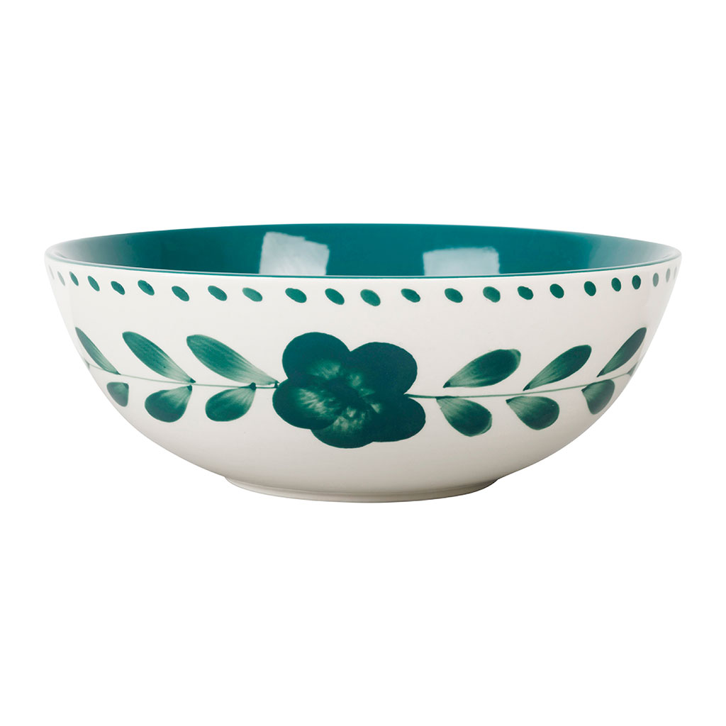 Son décor floral émeraude, peint à la main sur un fond blanc lumineux, évoque les tables estivales et les ambiances du Sud.