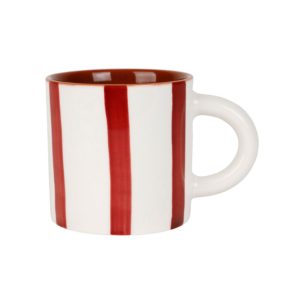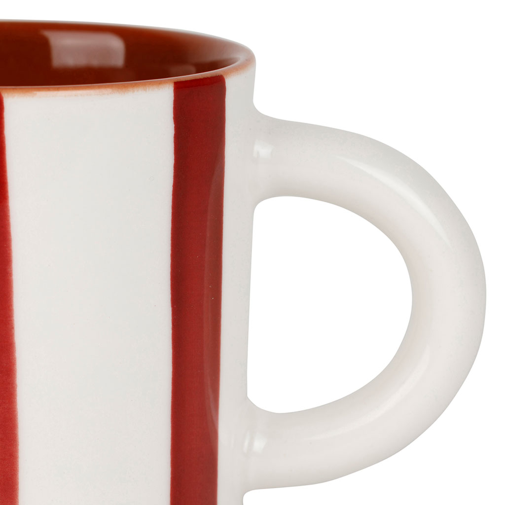 Son motif rayé aux teintes bordeaux et blanc se marie parfaitement avec un intérieur en terracotta, apportant une touche d'originalité à chaque gorgée.