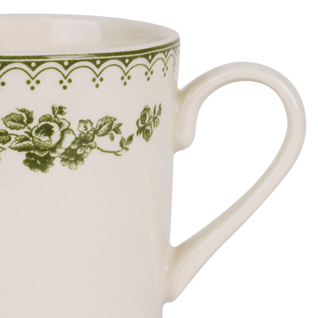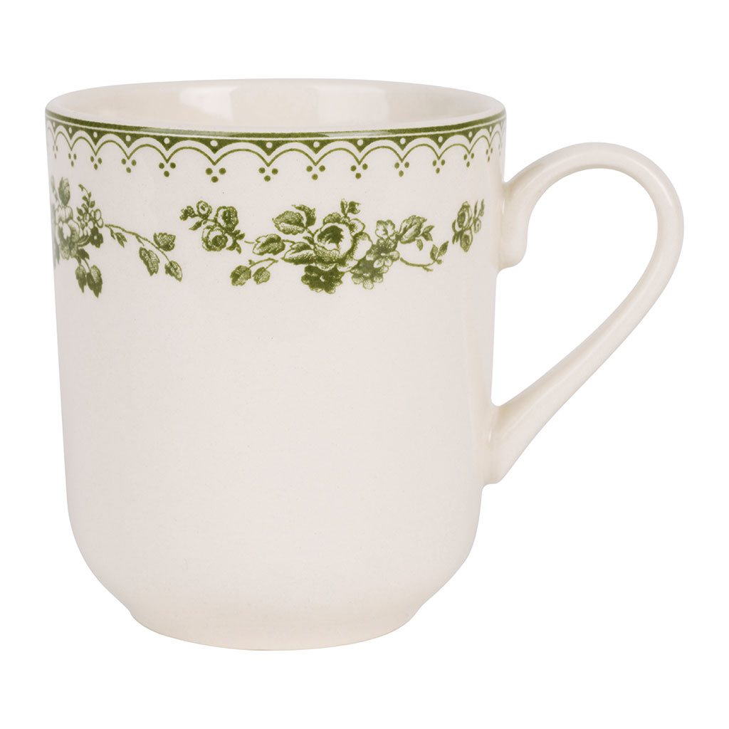 Voici la tasse haute en faïence vert de la collection Faustine, une pièce incontournable pour apporter une touche de charme à votre table.