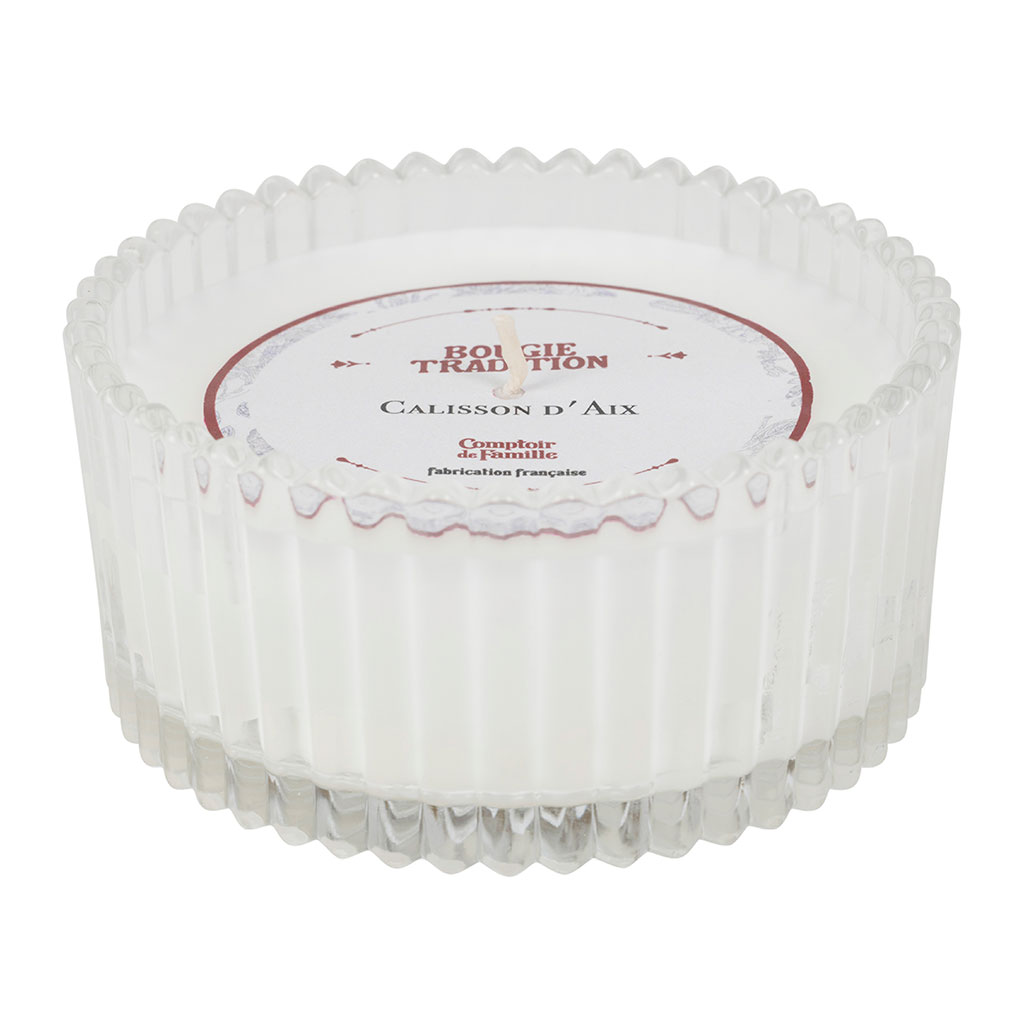 Découvrez notre bougie en verre parfumée au calisson, un véritable voyage olfactif qui évoque la douceur de la Provence.