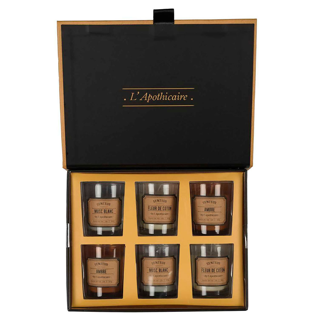 05 56 69 68 67-contact@fabriquedestyles.frCoffret de 6 bougies parfumée musc blanc, fleur de coton et ambre 6h - Apothicaire