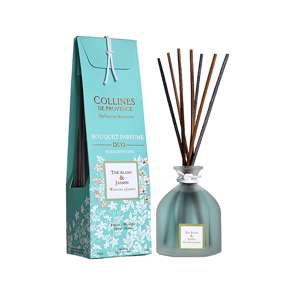Laissez-vous charmer par l'élégance du Bouquet Aromatique Collines de Provence au flacon exclusif. Ses tiges de rotin naturelles diffusent en continu des notes parfumées dans votre intérieur.
