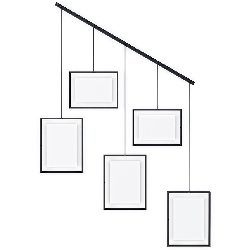 PRESENTATION ADAPTABLE : Chaque photo peut être interchangée en déplacant la tige sur la barre horizontale. La barre verticale peut elle même être suspendue inclinée de facon à suivre la pente d'un escalier ou d'une sous pente de toit.