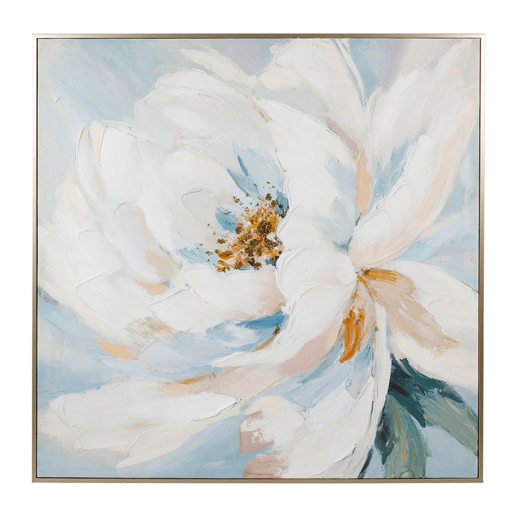 Cette peinture sur toile de 90x90 cm met en scène de magnifiques pivoines bleu et blanc, créant un effet visuel captivant et apaisant.
