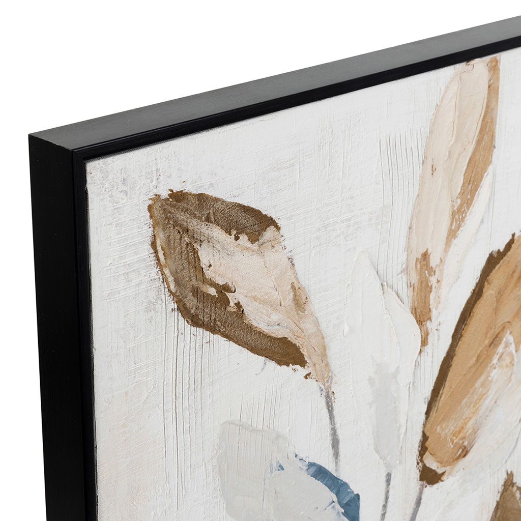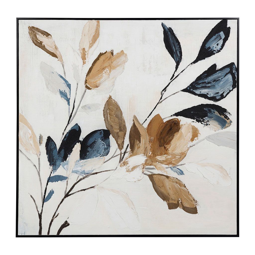 Les feuilles peintes dans des nuances de brun, beige et bleu nuit semblent danser sur un fond clair, apportant une touche de douceur et de contraste à votre mur.