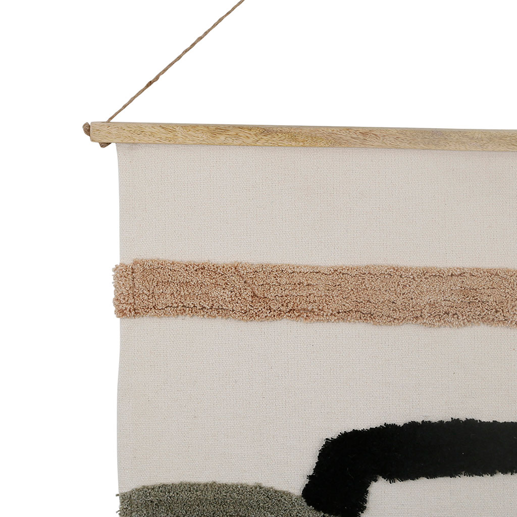 Découvrez notre TOILE tuftée en coton écru, brun et sauge, inspirée des teintes de la terre brûlée. Apportez une touche naturelle et chaleureuse à votre intérieur avec cette toile unique.