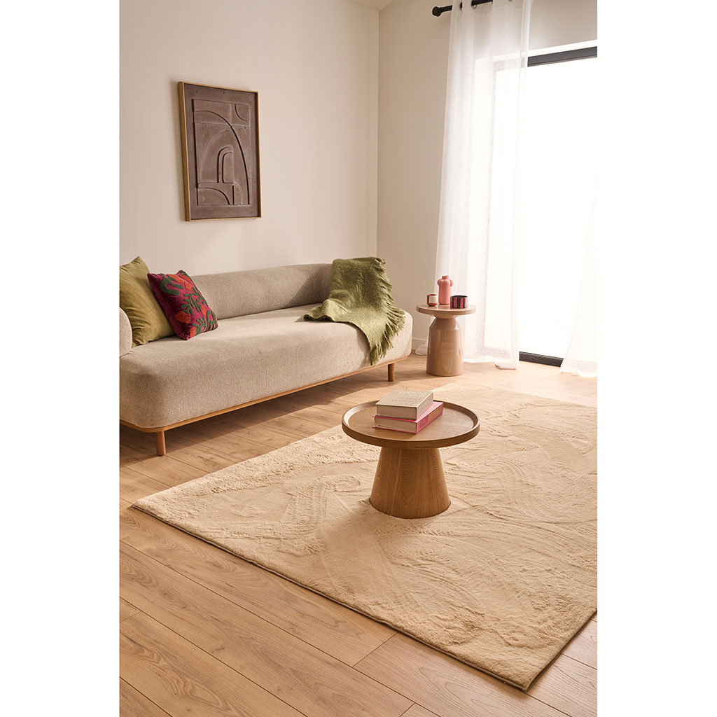 Avec sa teinte beige douce et apaisante, le tapis Nube en fausse fourrure insuffle une atmosphère chaleureuse à votre intérieur.
