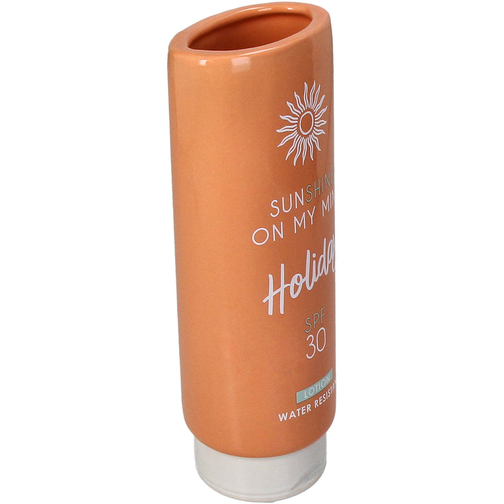 Ce vase en faïence orange adopte la forme amusante d’un tube de crème solaire pour une touche déco pleine de fraîcheur et de bonne humeur.