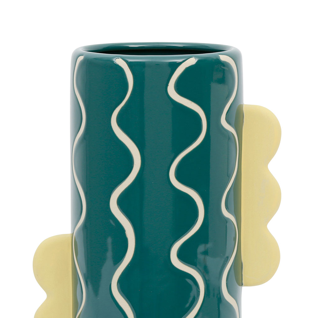 Apportez une touche d'originalité et de modernité à votre maison avec le Vase cylindrique en grès émeraude et jaune Lumi.