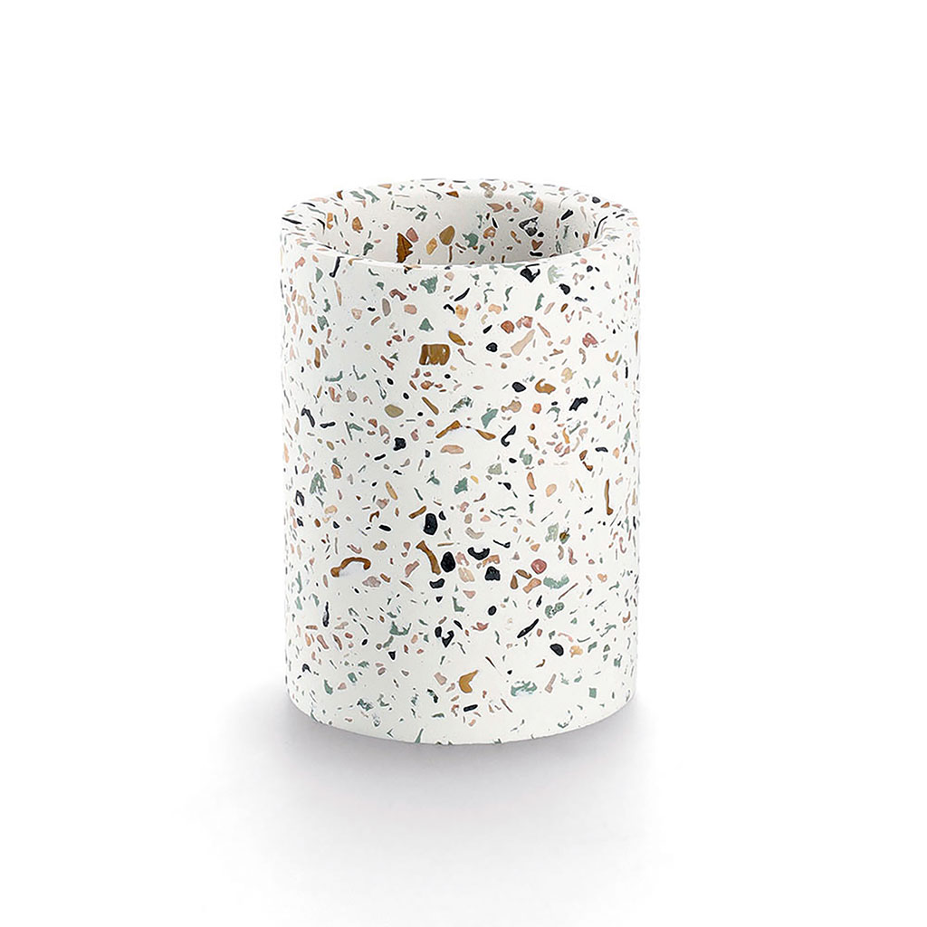 Le gobelet à brosse à dents en ciment de qualité arbore un élégant motif terrazzo. La gamme comprend également une brosse WC, un distributeur de savon et un porte-savon : un ensemble élégant pour toute salle de bains.