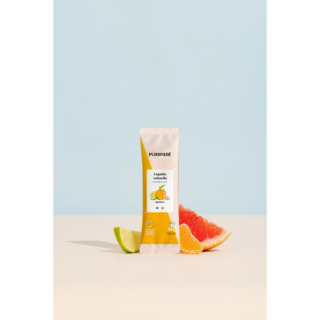 Le liquide vaisselle en poudre Pimpant aux agrumes constitue une alternative durable et sensorielle pour le nettoyage efficace de votre vaisselle au quotidien.