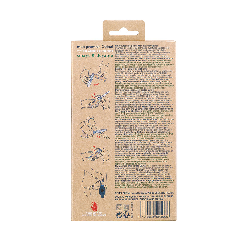 Ce kit inclut un couteau Opinel adapté aux petites mains ainsi qu'un étui pratique pour un transport sécurisé.