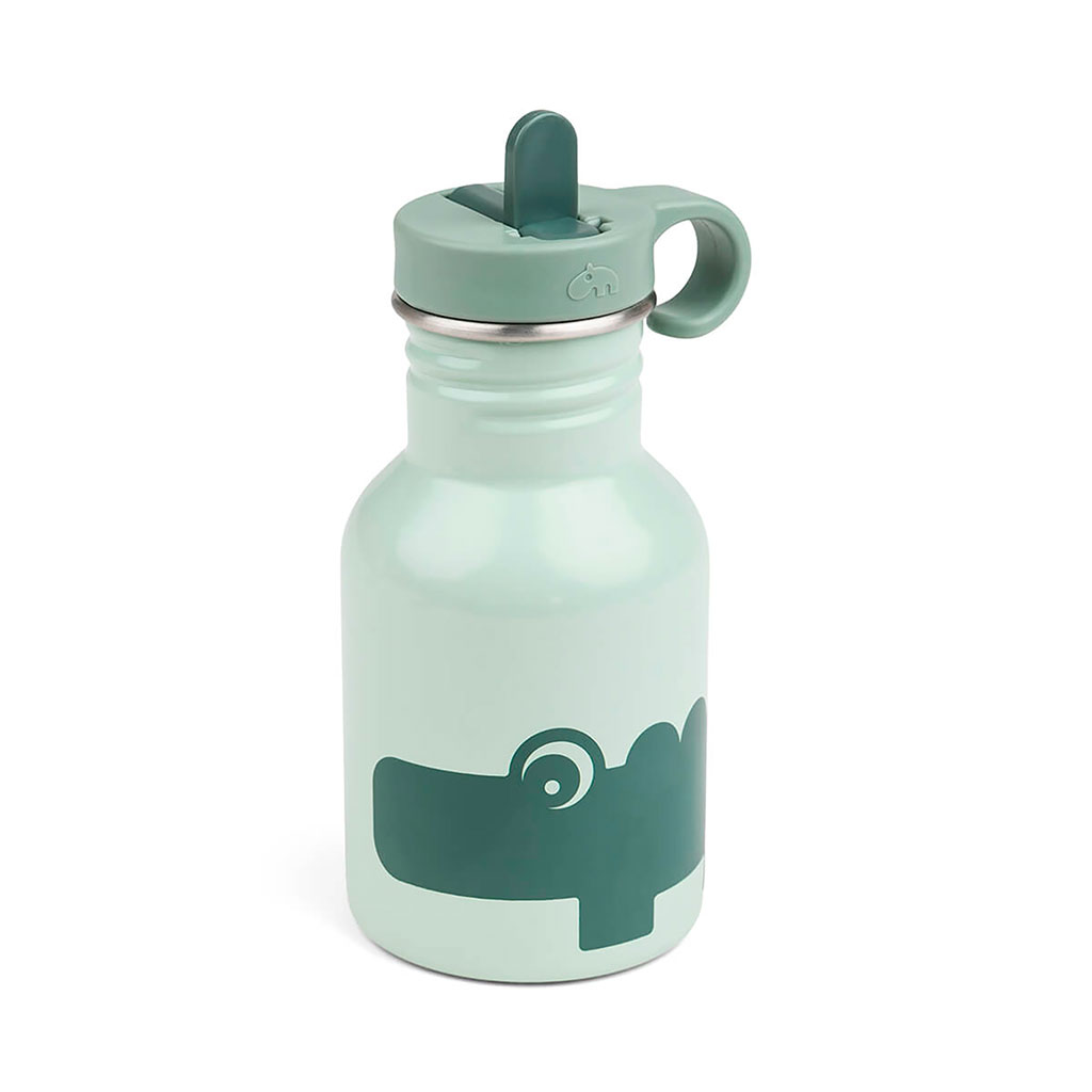 Cette gourde pratique en métal aux tons verts est décorée de l'énergique Croco.