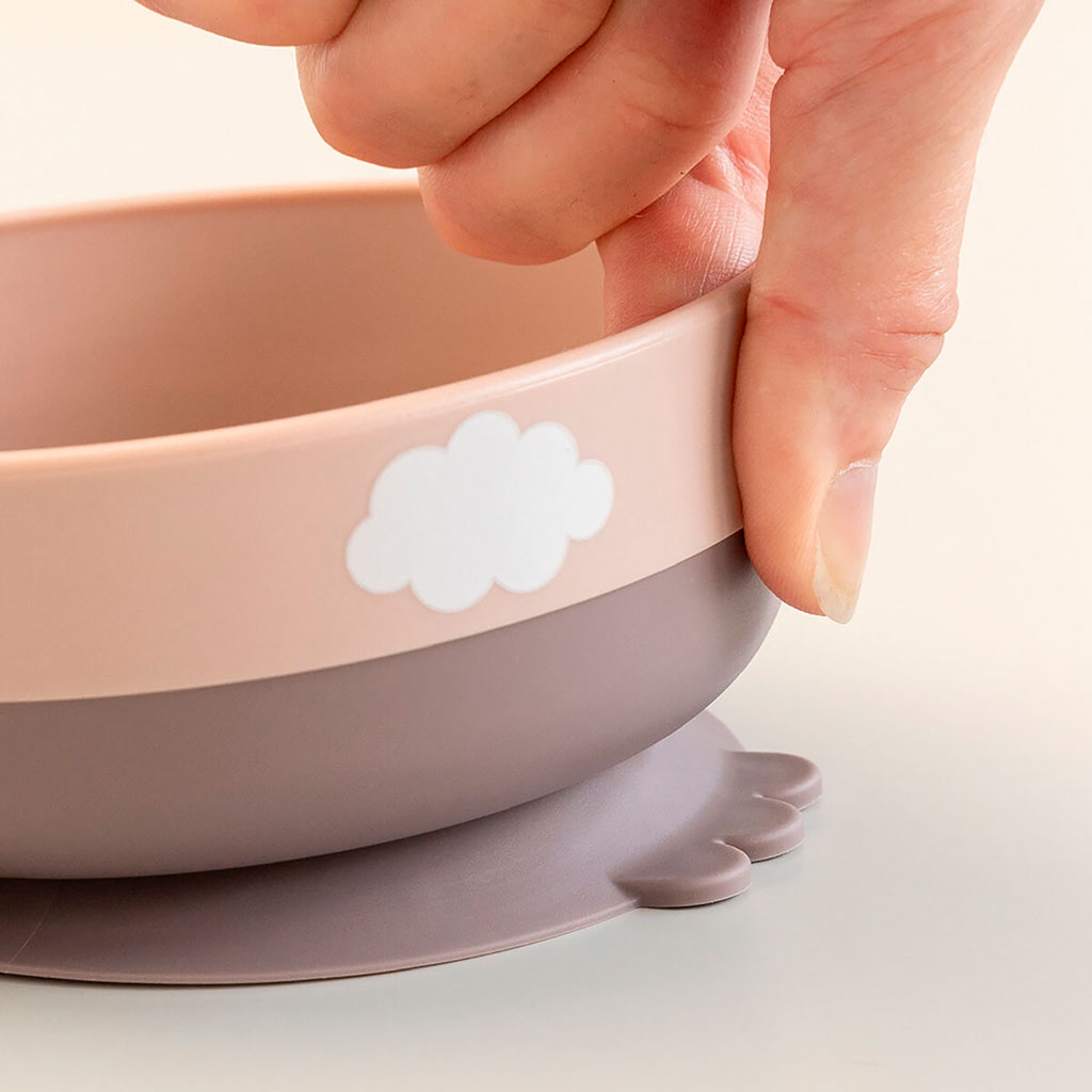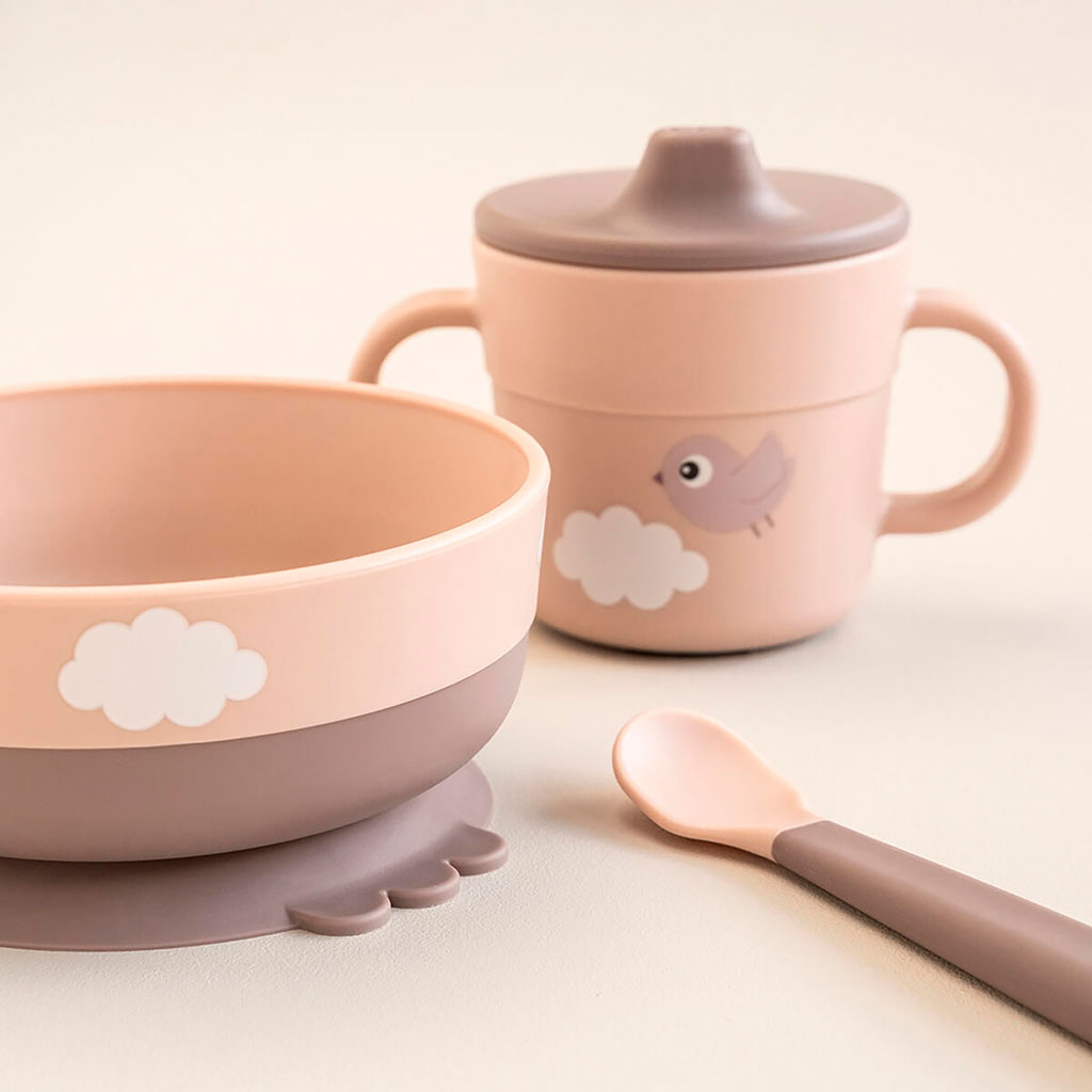 Le coffret repas rose est décoré d'un joyeux imprimé de Happy clouds.