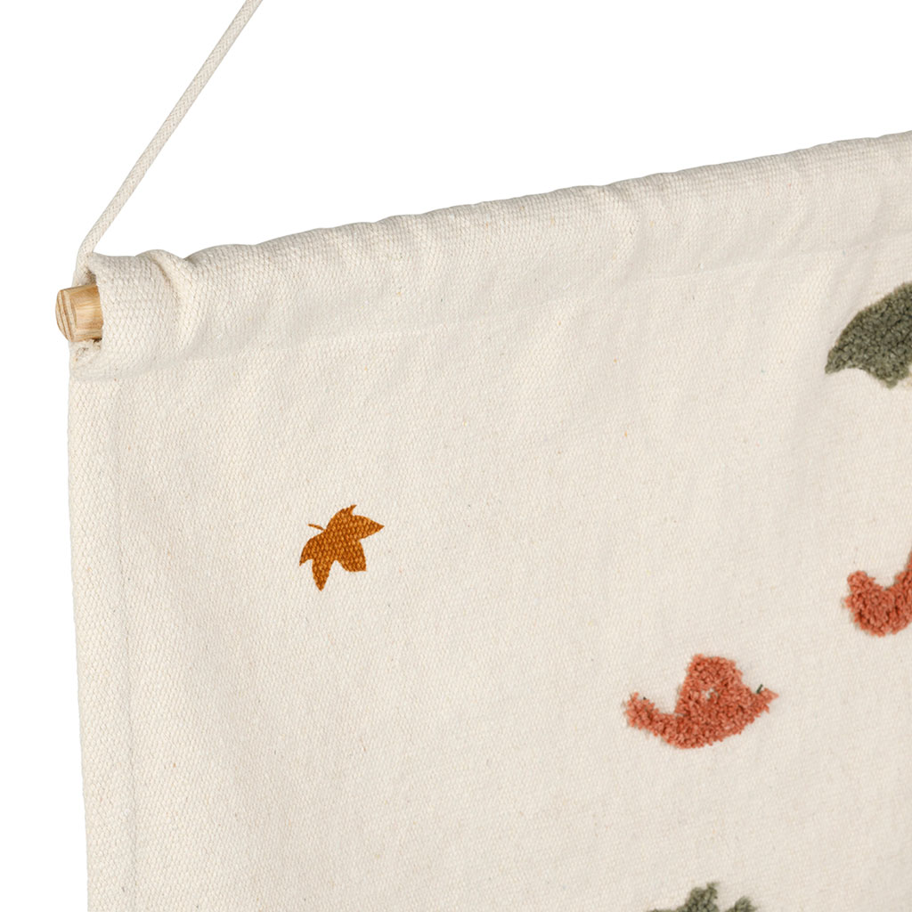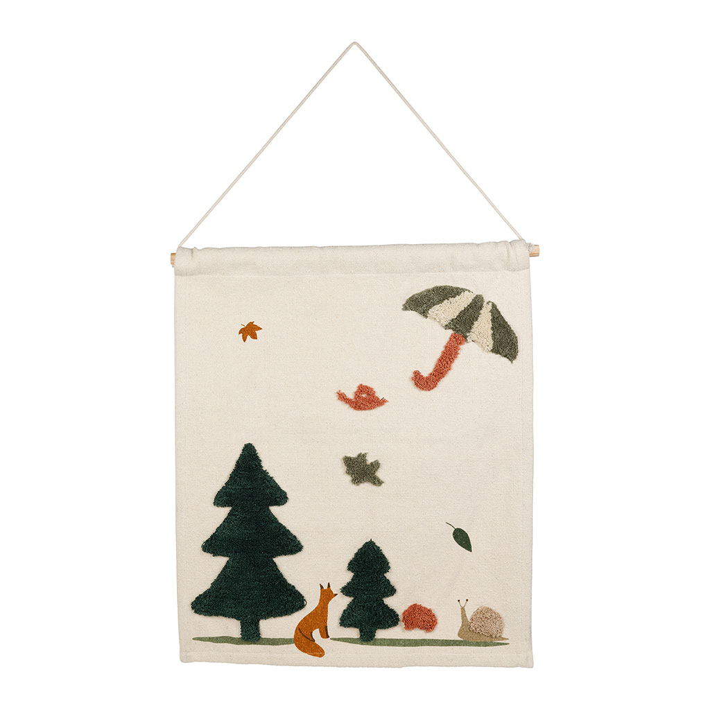 Transformez la chambre de votre enfant en un véritable havre de paix naturel avec cette toile tuftée représentant des sapins, sur le thème "Cueillette d'hiver".