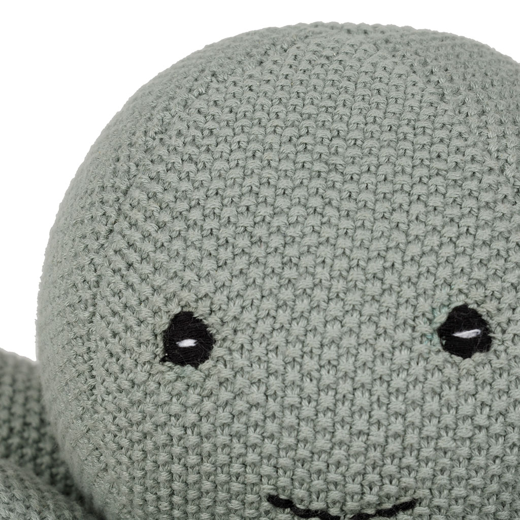 Découvrez la peluche en forme de poulpe fabriquée en coton sauge, un compagnon idéal pour l'heure du jeu ou du dodo.