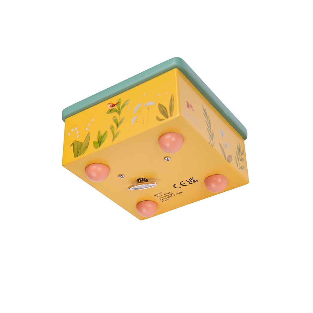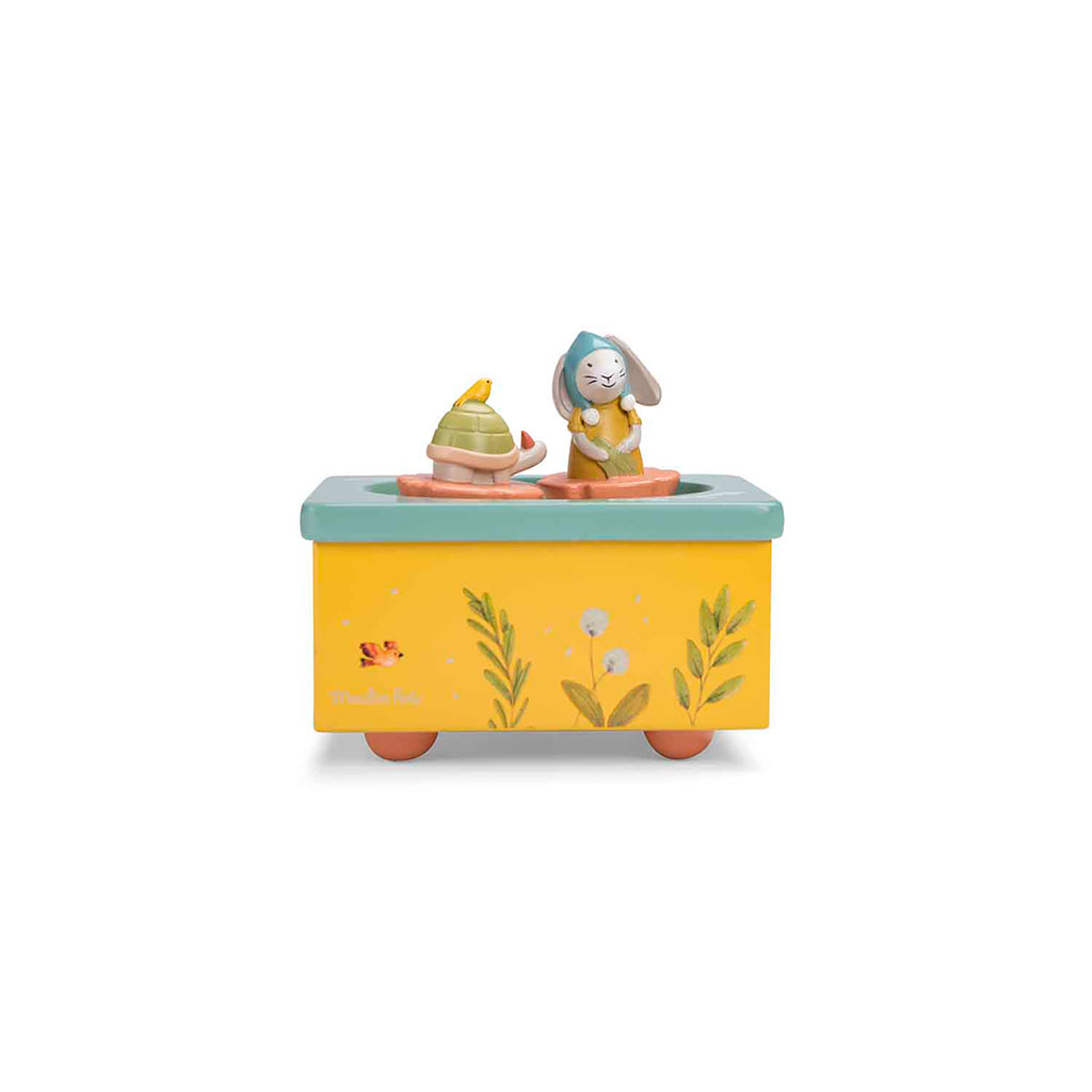 Plongez dans l’univers poétique du jardin avec cette boîte à musique jaune de la collection Trois petits lapins.