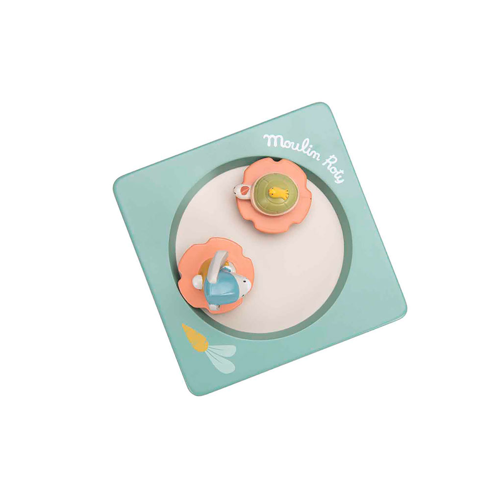 Le lapin et la tortue tournent doucement au son d’une douce mélodie, invitant à la rêverie et au calme avant le coucher.