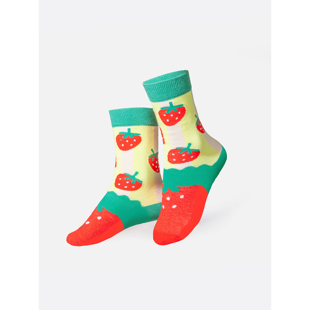 Ces chaussettes colorées aux motifs de fraises et feuillages sont parfaites pour ajouter une touche fruitée et joyeuse à la garde-robe des enfants.