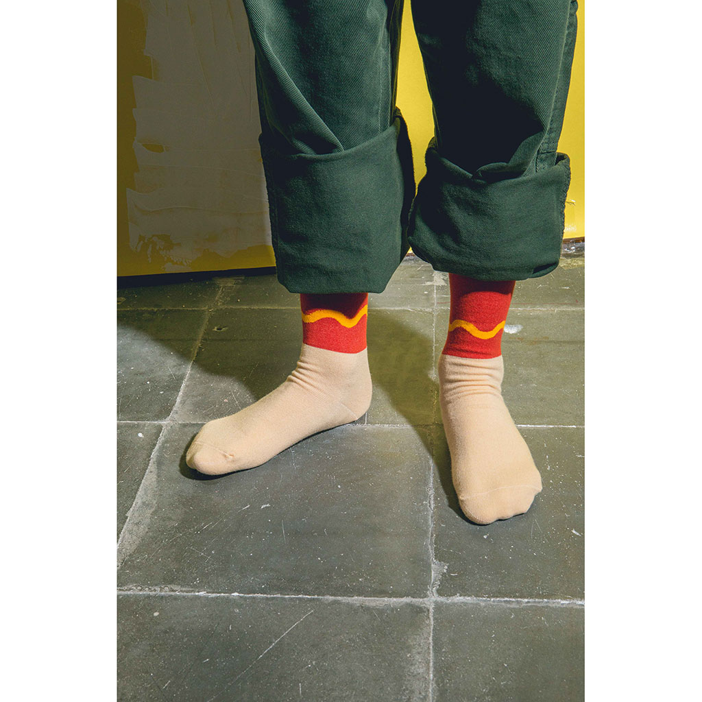 Avec leur design rouge et beige rehaussé d’une touche de jaune façon moutarde, ces chaussettes rappellent un délicieux hot dog prêt à être croqué.