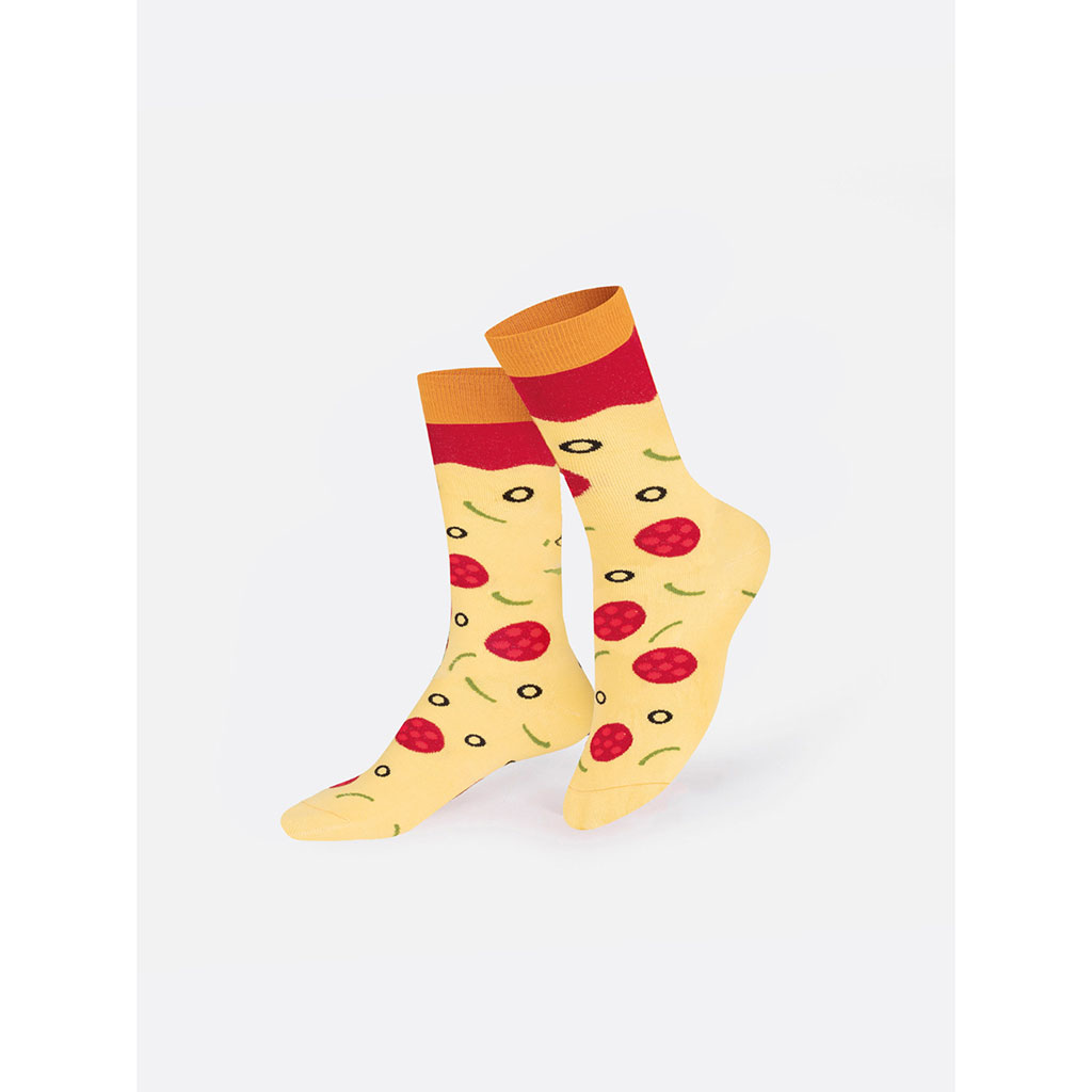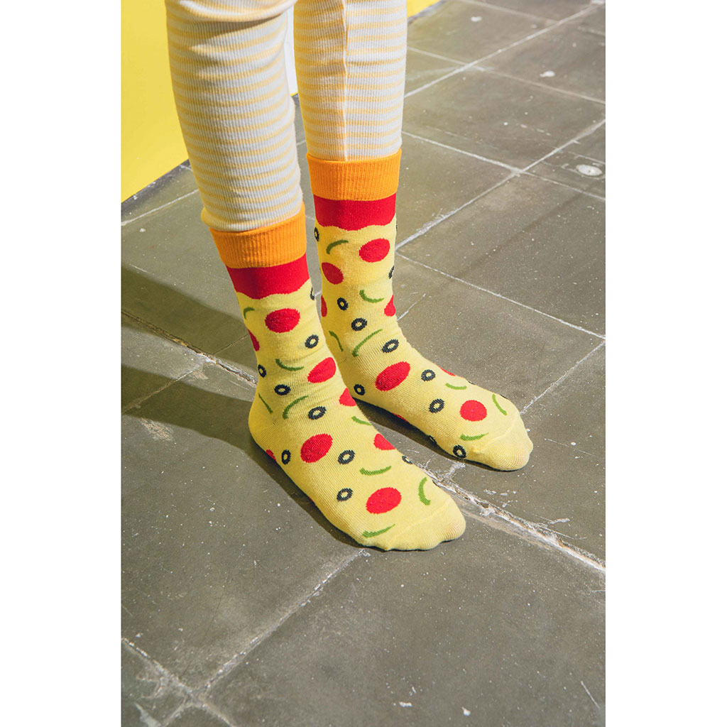 Avec leur motif de pepperoni, d’olives et de fromage fondu, ces chaussettes évoquent une délicieuse part de pizza tout juste sortie du four.