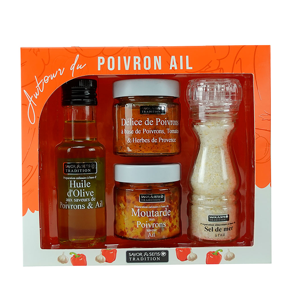 Contenant une huile d’olive au Poivron et à l’Ail, une moutarde au Poivron et à l’ail, un Délice de Poivrons, tomates et Herbes de Provence, ainsi qu’un moulin de sel de mer à l’Ail,