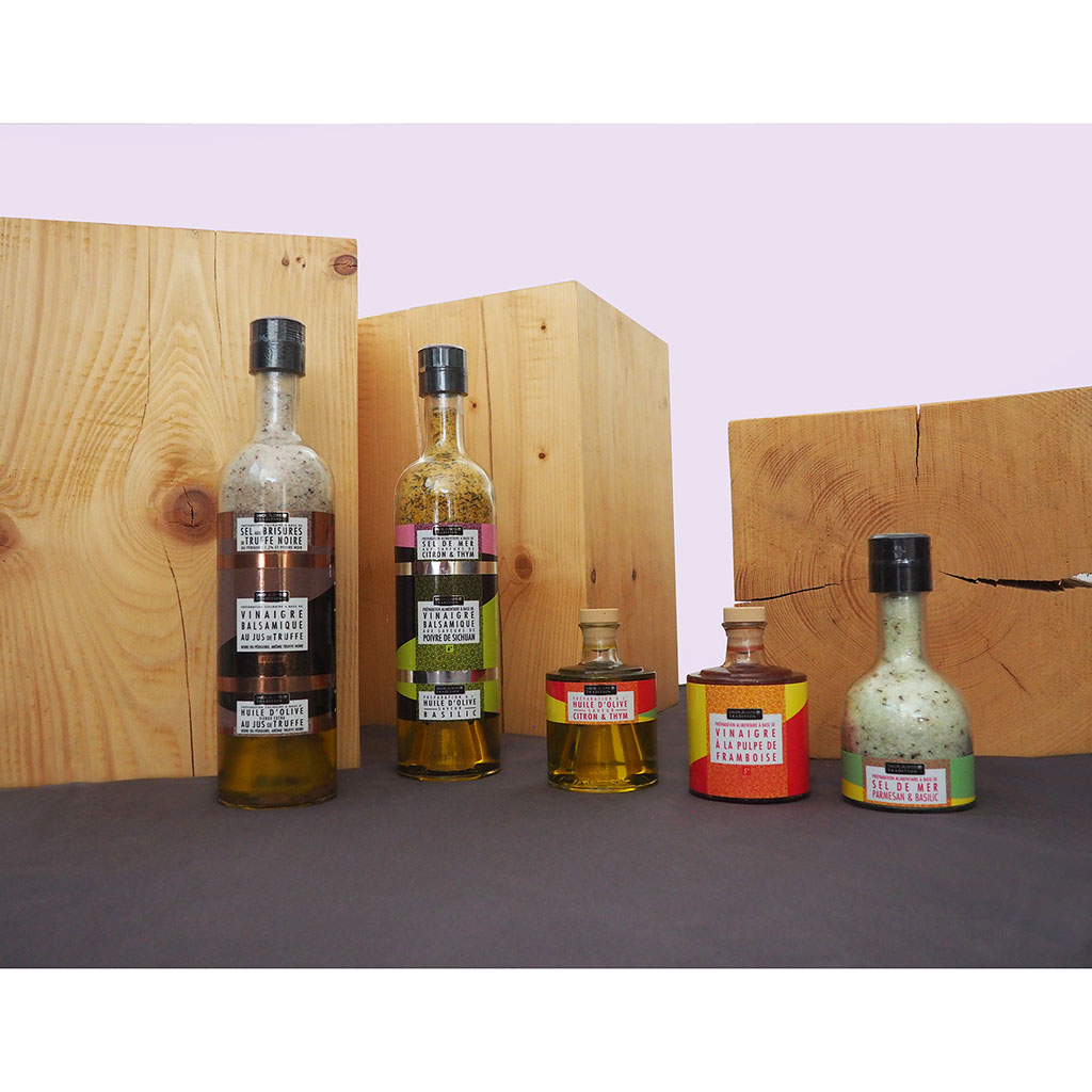05 56 69 68 67-contact@fabriquedestyles.frEmpilable magnum sel, vinaigre balsamique, huile d'olive à la truffe.