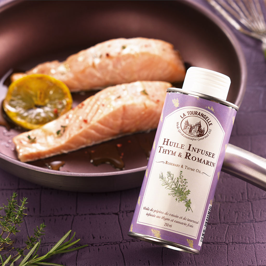 Embellissez vos assiettes et éveillez vos papilles avec notre Huile infusée thym/romarin de La Tourangelle.
