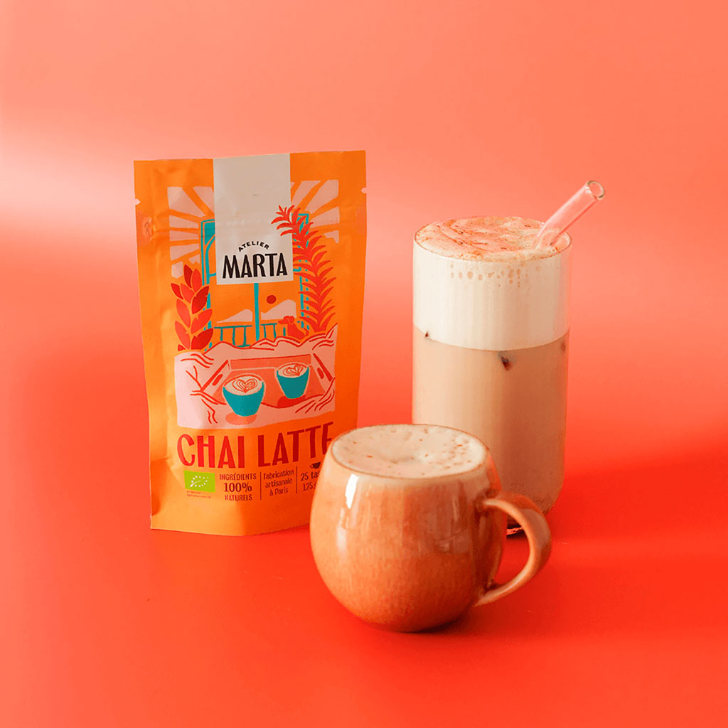 Ajoutez une cuillère à café (5 g) de votre chai latte Atelier Marta dans une tasse et ajoutez un peu de lait chaud de votre choix (vache, avoine, riz, coco etc).