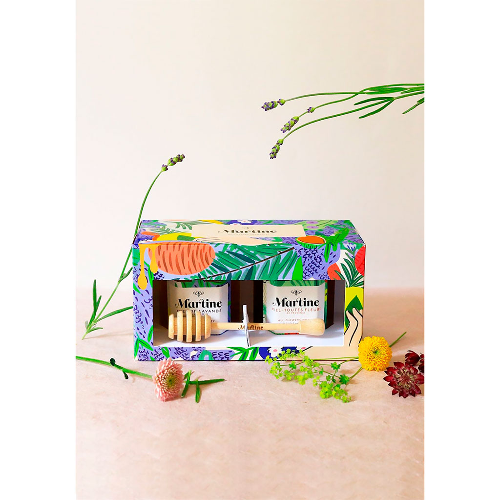 Le Coffret Gourmand comprend deux pots de miel 250g récolté en France, accompagnés d’une jolie cuillère en bois gravée Martine.