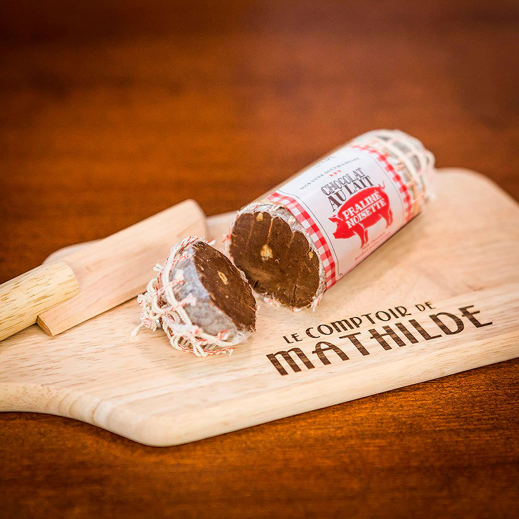 Découvrez un délicieux mariage de saveurs avec notre saucisson unique au chocolat au lait et à la praline noisette.