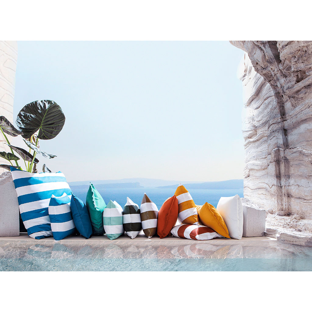 Son motif rayé kaki et blanc évoque le charme des terrasses en bord de mer et s’intègre parfaitement dans tout espace extérieur.