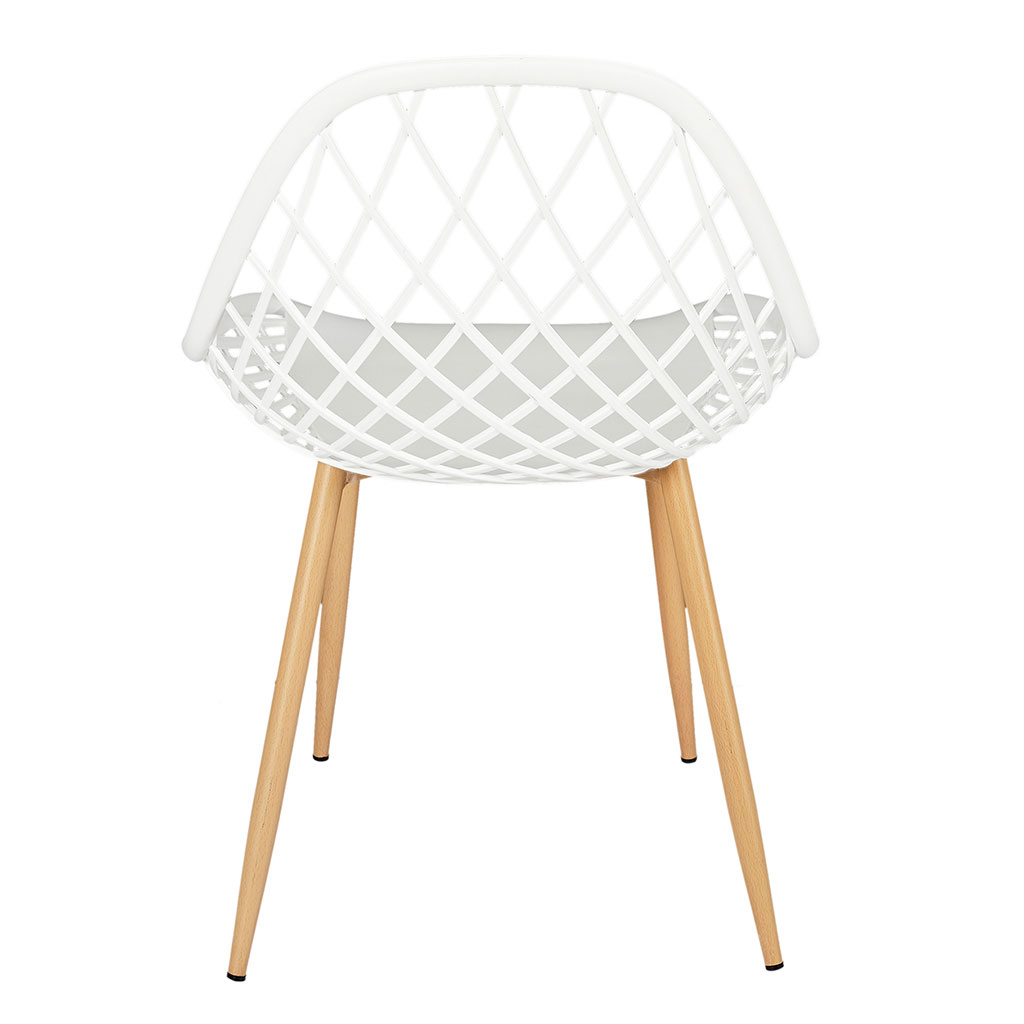 Sa structure en plastique blanc contraste joliment avec ses pieds imitation bois, en métal robuste, pour une assise à la fois stable et facile à déplacer.
