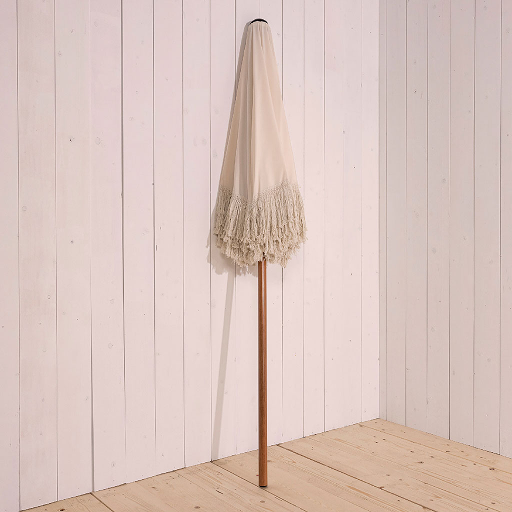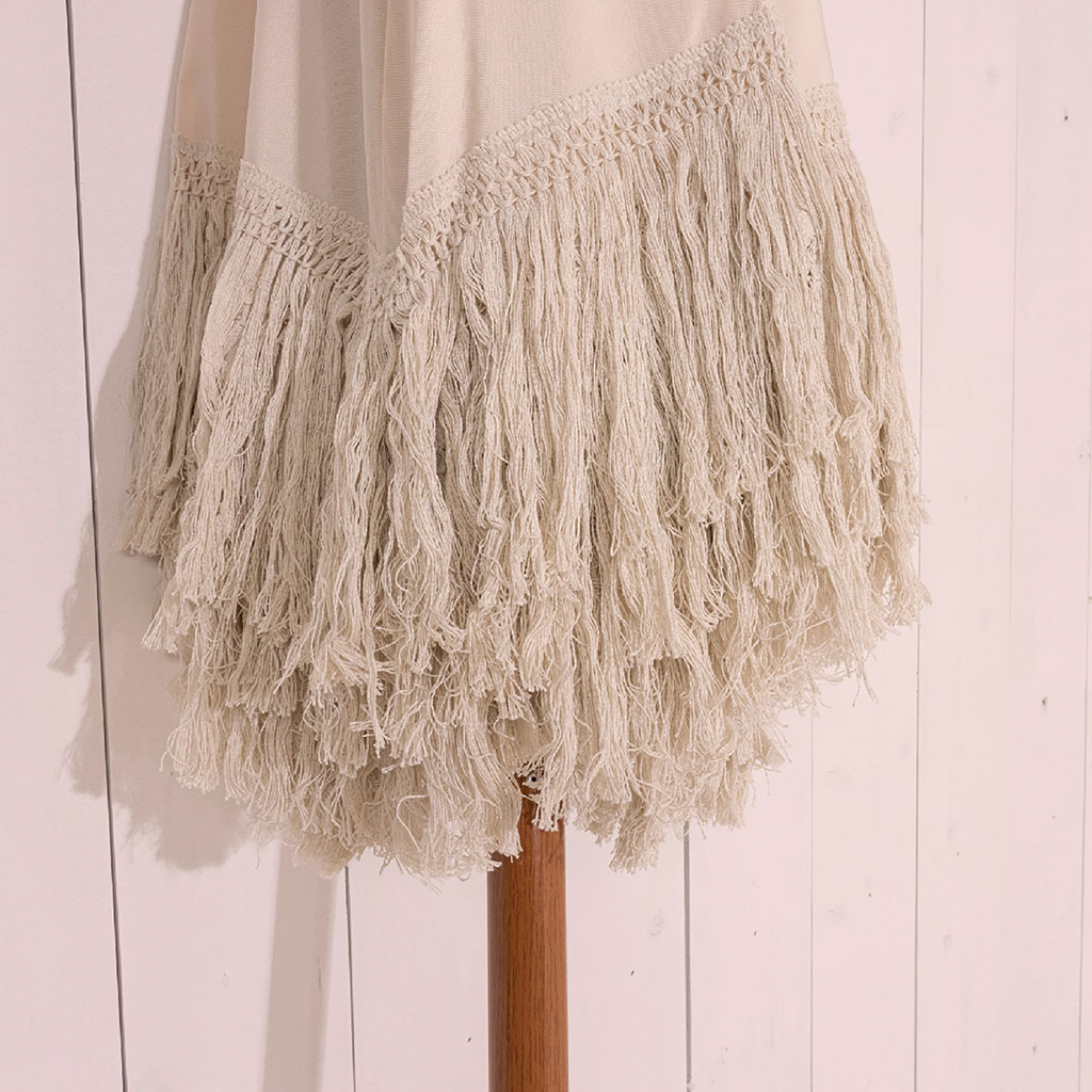 Ce parasol blanc cassé de 200 cm de diamètre se distingue par sa toile en polyester robuste bordée de généreuses franges en coton beige.