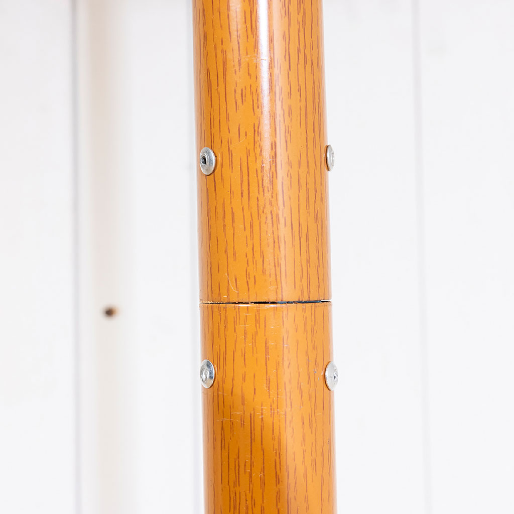 Son mât en acier au fini bois naturel apporte une touche organique qui contraste avec le sommet noir discret de la structure.