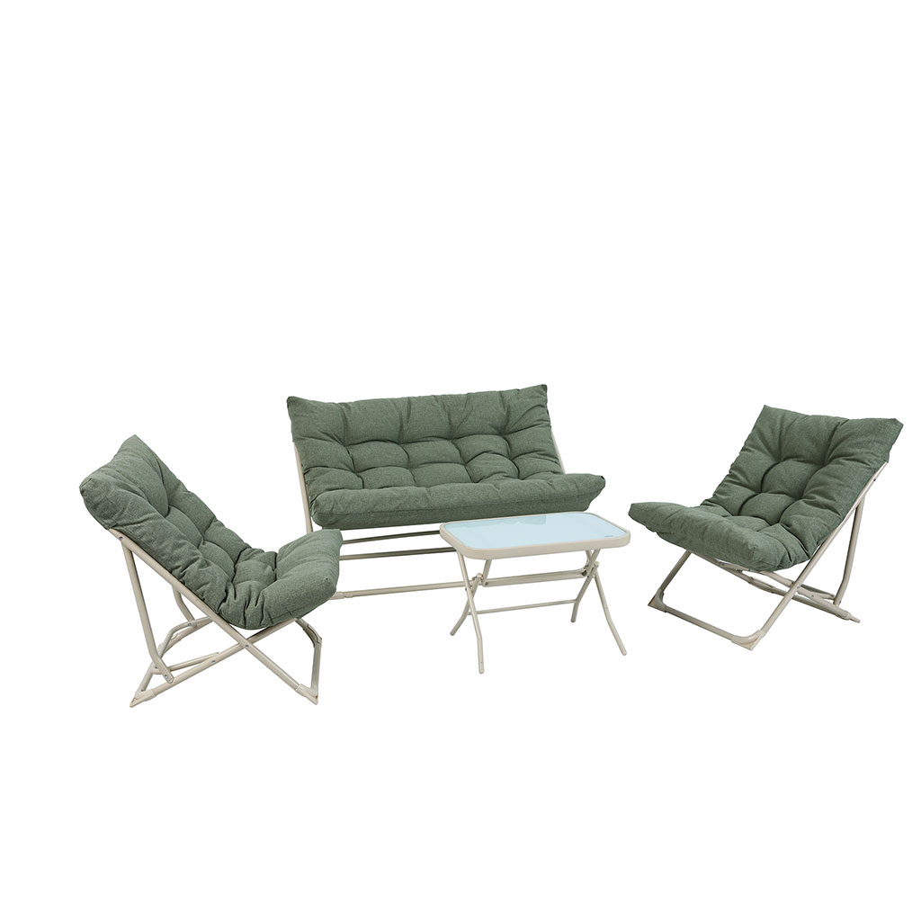 Composé de 2 fauteuils pliants, 1 sofa pliant et 1 table basse pliante.