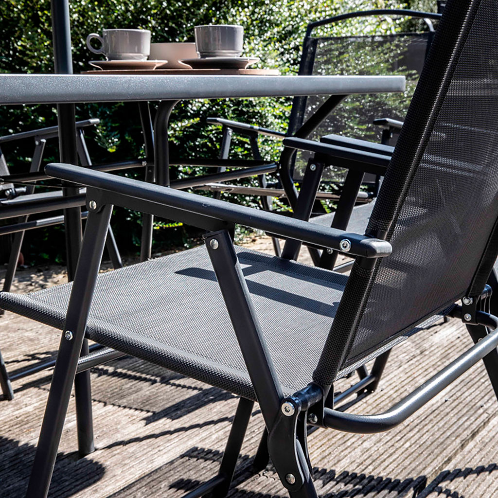 05 56 69 68 67-contact@fabriquedestyles.frEnsemble table de jardin, 6 chaises et parasol central noir en acier 140x80cm - Braga