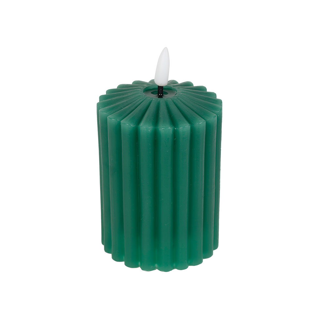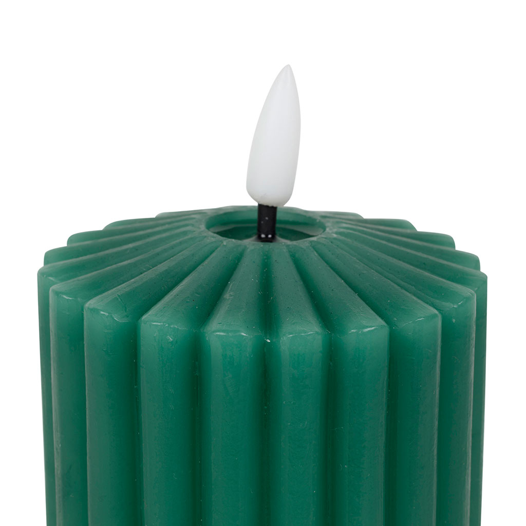 Découvrez l'effet apaisant d'une lueur douce et chaleureuse avec notre bougie LED en forme de pilier, habillée d'un vert apaisant et mesurant 14 cm de hauteur.