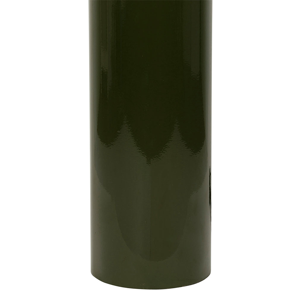 Sa structure verticale se compose d'un pied cylindrique robuste en métal coloris vert kaki, surmonté d'un abat-jour arrondi de teinte crème.