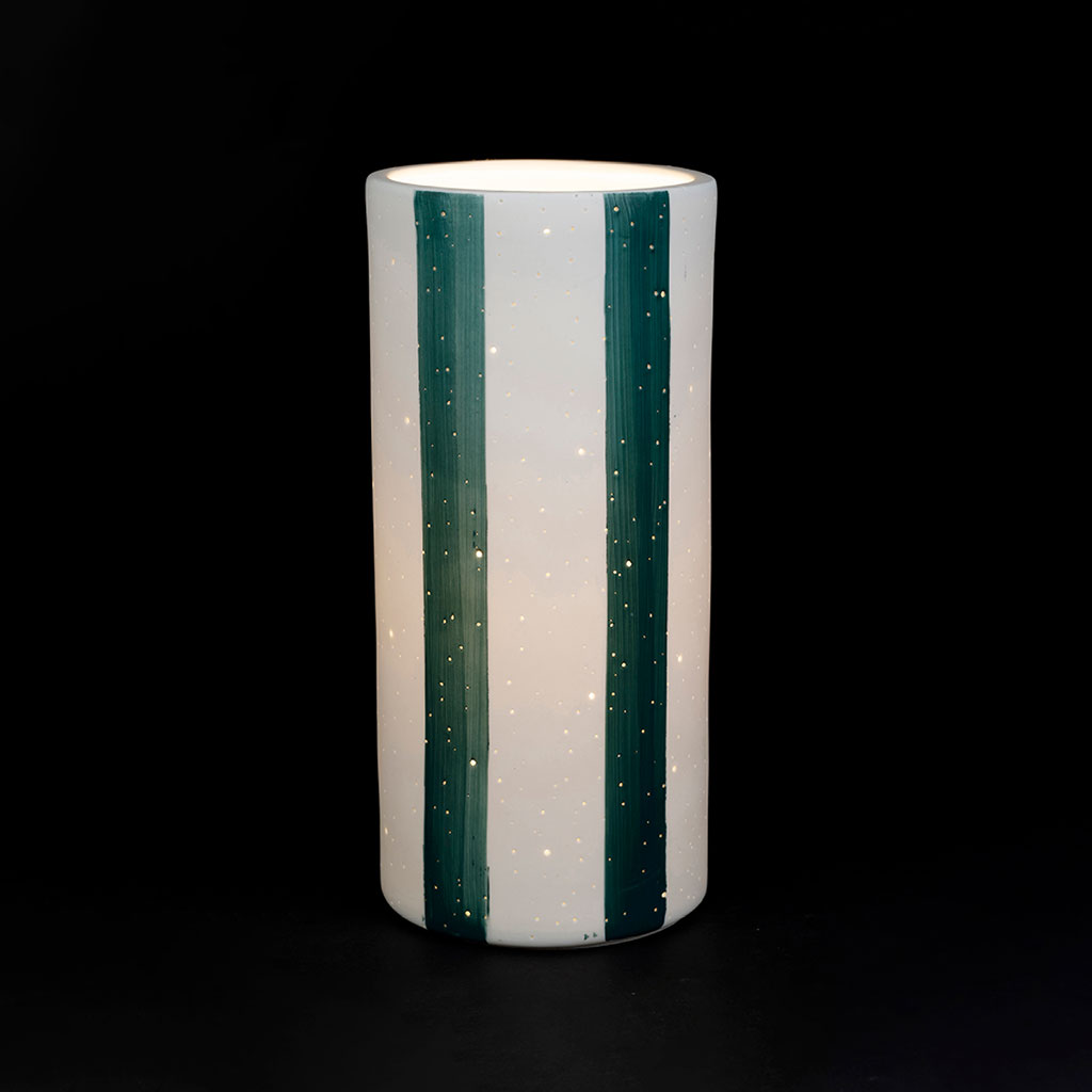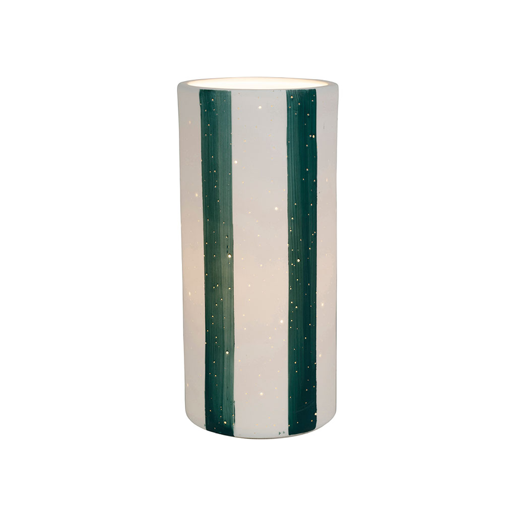 05 56 69 68 67-contact@fabriquedestyles.frLampe cylindre en porcelaine rayée émeraude et blanc h24cm E14 - Alaria