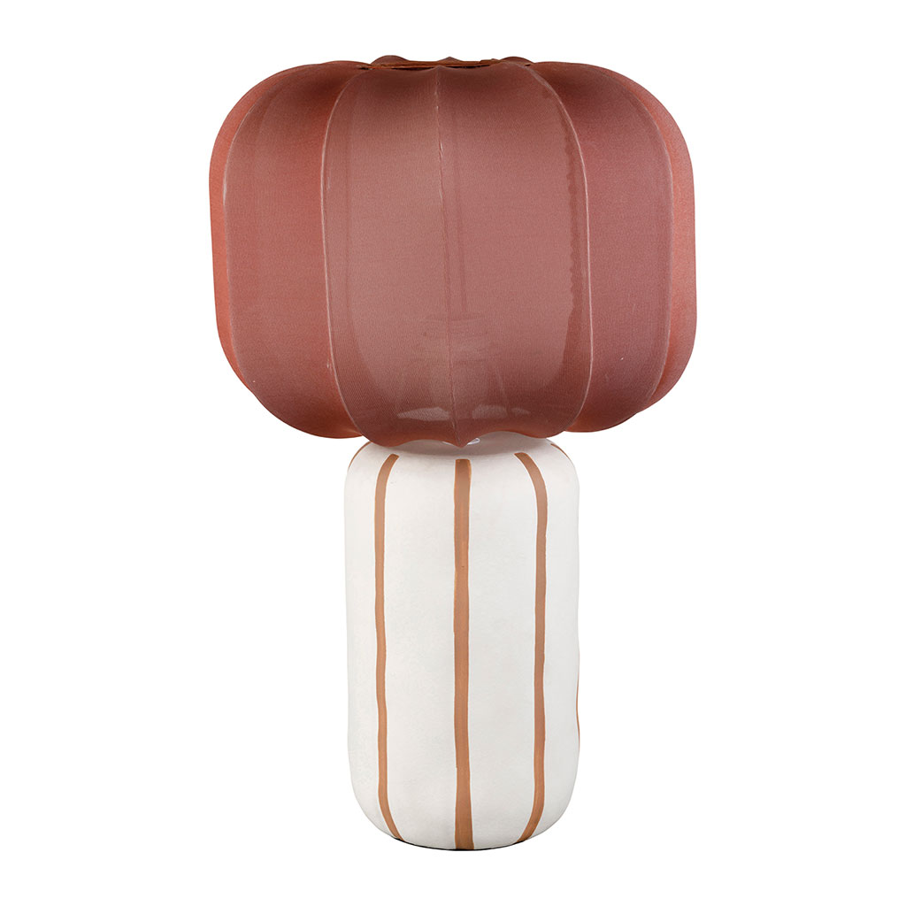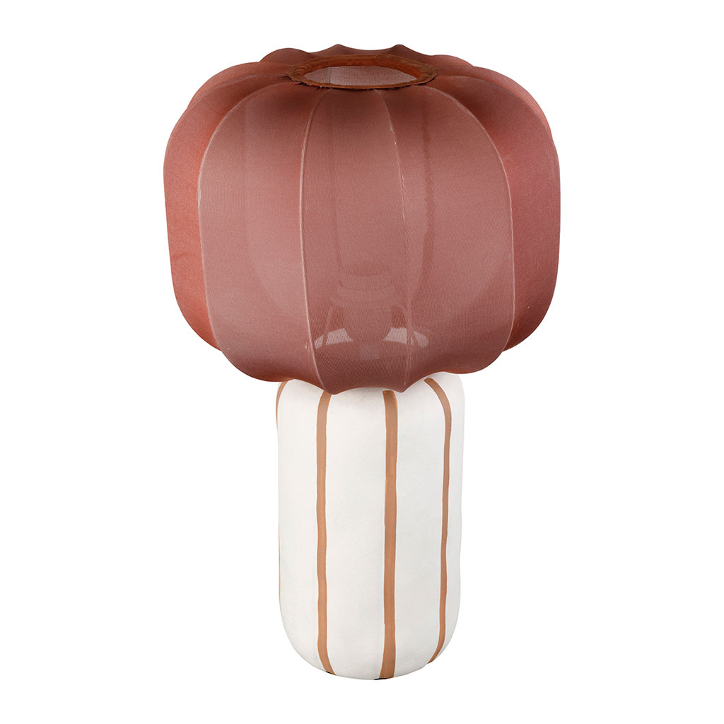Le pied en céramique arbore des rayures horizontales aux tons terreux, créant un contraste doux avec l'abat-jour cylindrique en textile clair.
