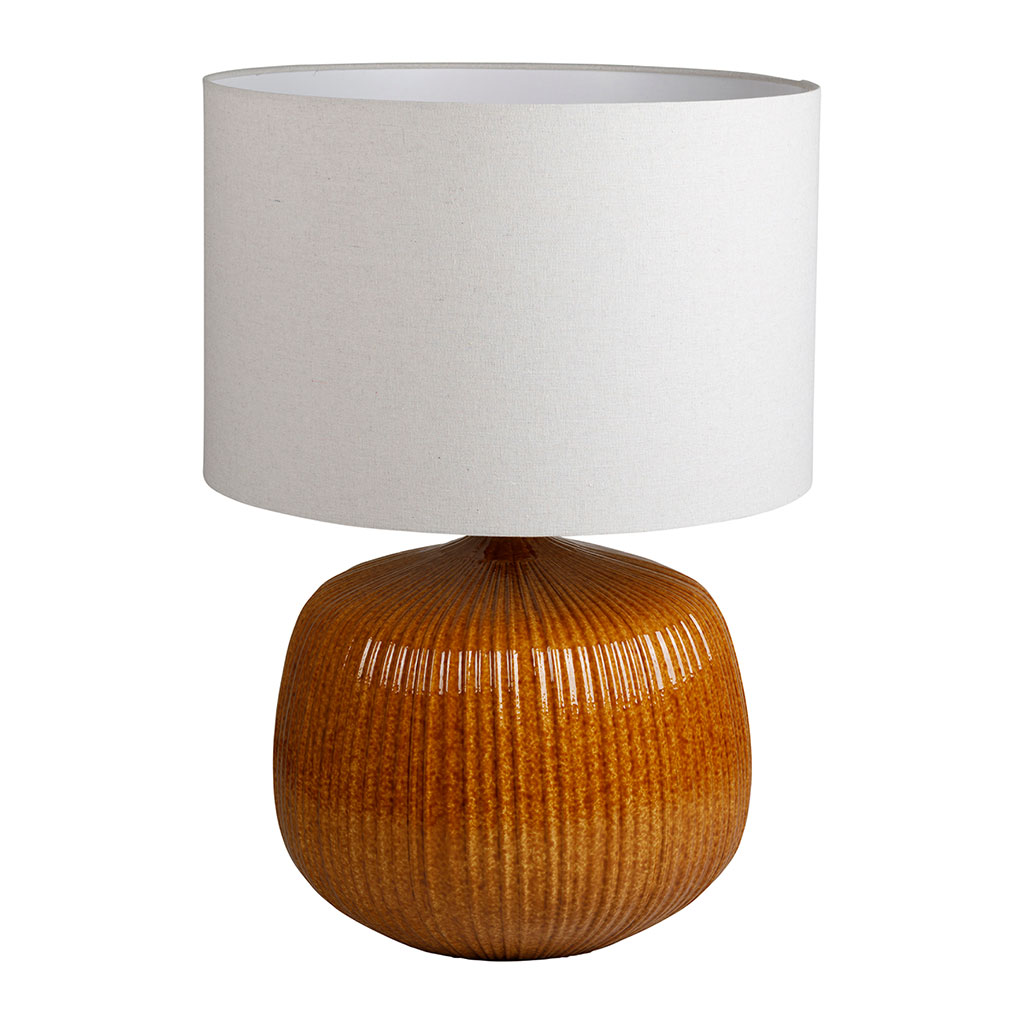 La lampe en lin et céramique ambre Klaros se distingue par sa base sculpturale aux nuances terreuses et organiques.