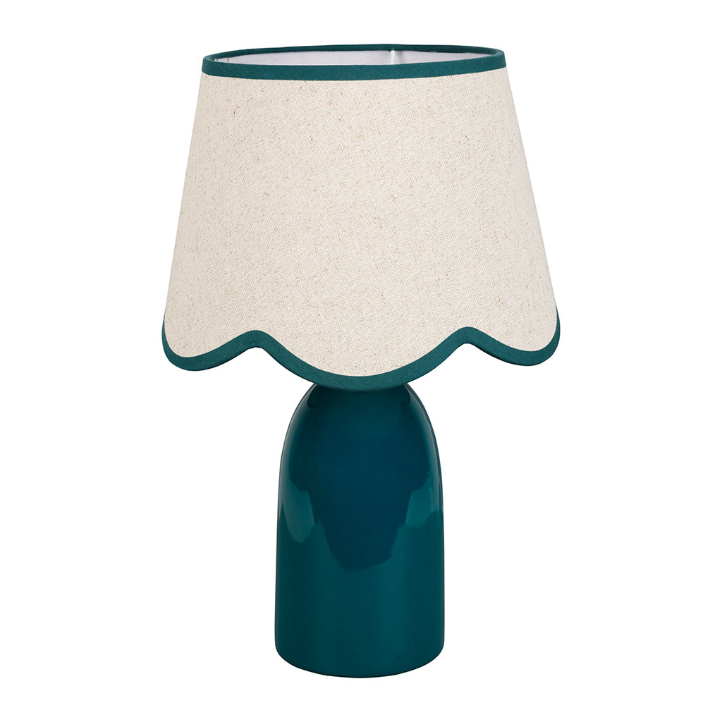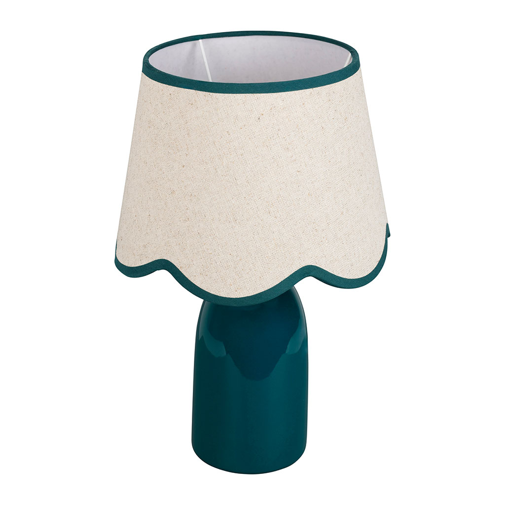 Son abat-jour en lin arbore une bordure inférieure ondulée, soulignée par un liseré contrastant qui apporte une touche de douceur et de fantaisie.